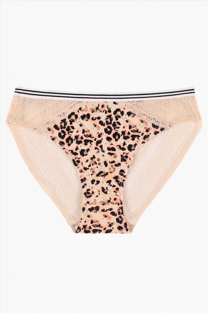 Трусы слипы женские бежевые изготовлены из полиамида. На талии имеется мягкая эластичная резинка, крепко удерживающая трусы во время носки. Средняя посадка обеспечивает удобство и свободу движений, подчеркивая естественные линии фигуры. Украшением трусов слипов являются кружевные вставки и анималистичный принт.