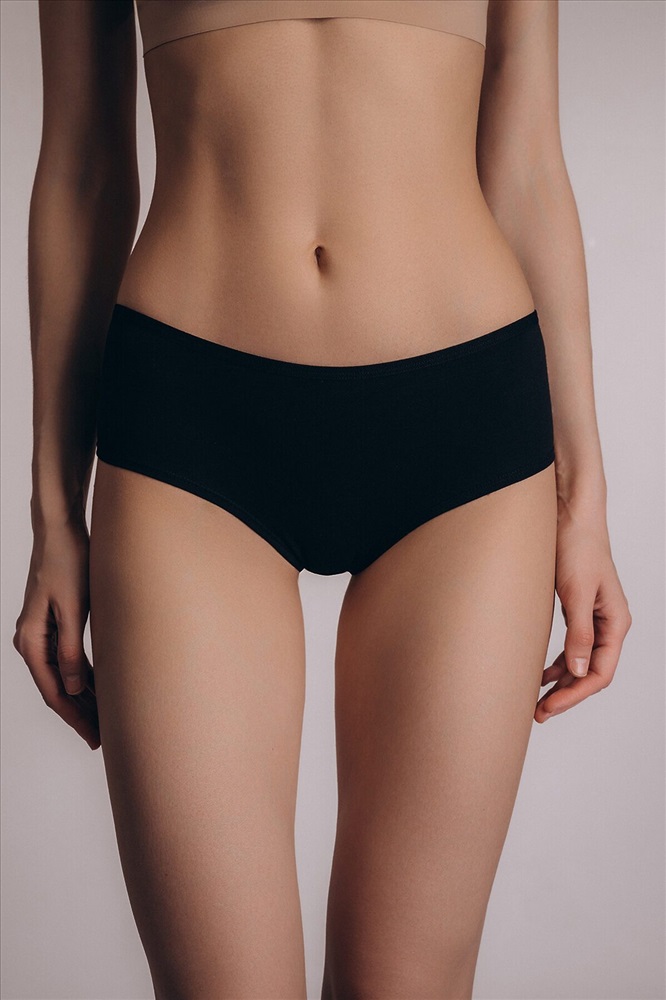 Чёрные трусы-слипы из натуральных материалов. Задняя часть украшена изящным кружевом, которое плавно перетекает на переднюю часть, создавая эффект рюшек в передней части.