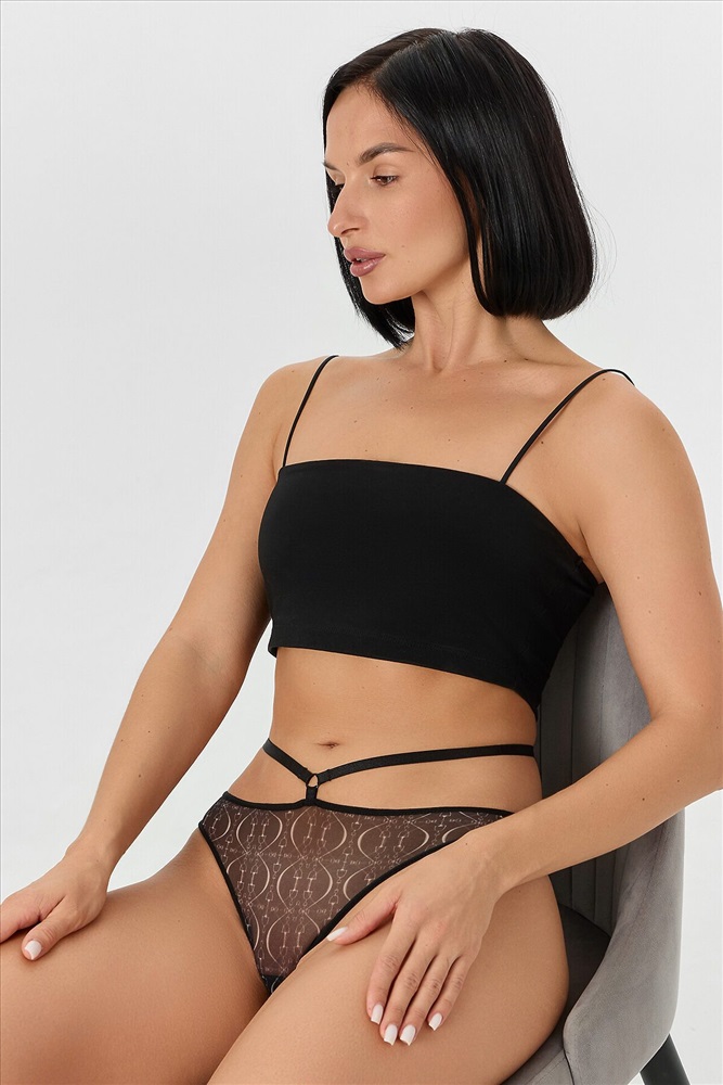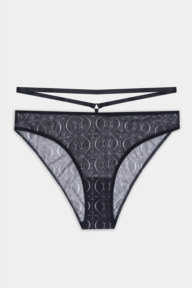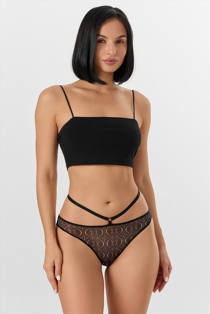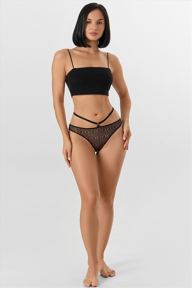 Трусы женские классического силуэта со средней посадкой из эластичной сетки. Передняя и задняя детали цельные. Подкладка ластовицы из кулирной глади, настрочена по переднему краю. По центру к передней детали прикреплена через кольцо декоративная эластичная тесьма. Талия и ножки обработаны эластичной тесьмой по лицевой стороне (жилка).