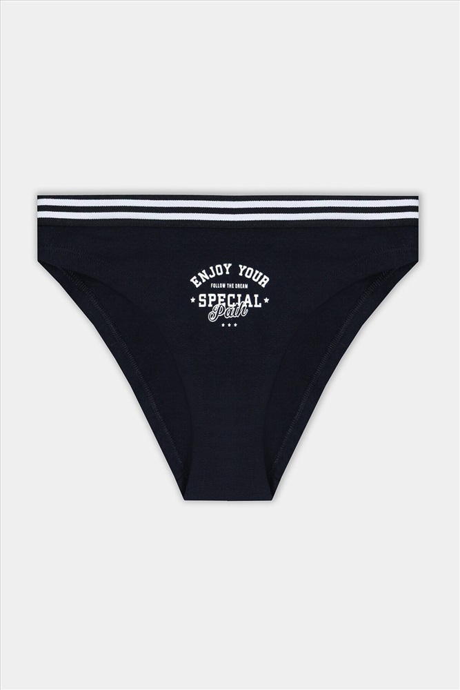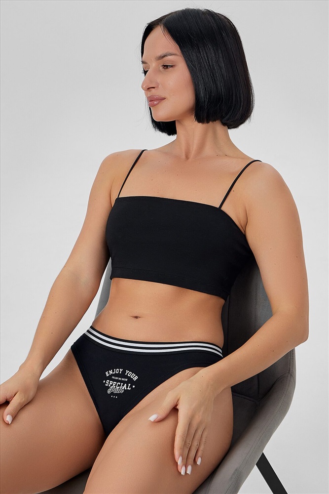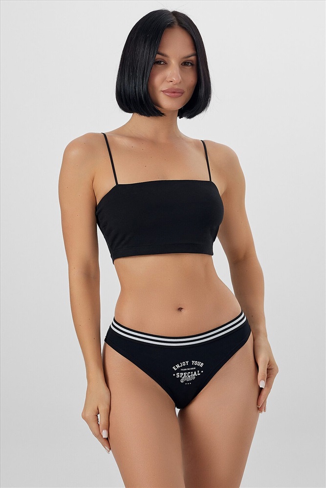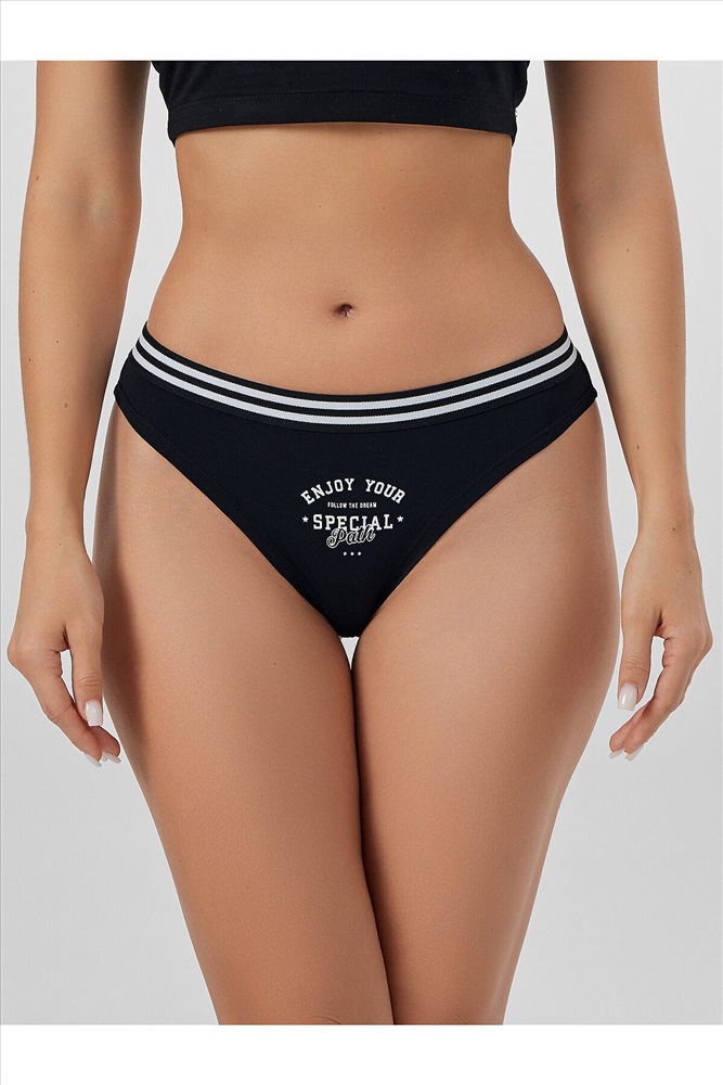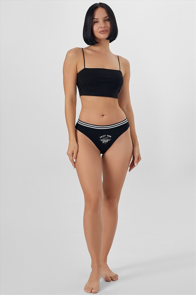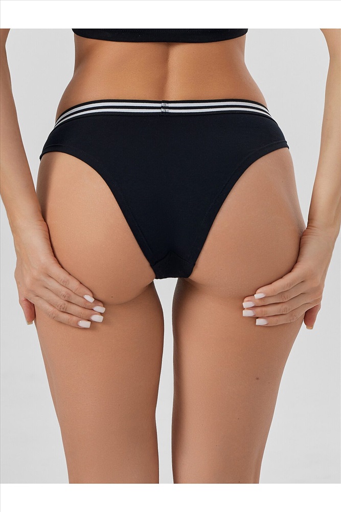 Трусы женские со средней линией талии силуэта «слип» из кулирного полотна.. Передняя и задняя детали цельные. Ластовица из кулирной глади отлетная по переднему срезу. По талии эластичная тесьма настрочена на п/ш с узким межигольным расстоянием. Ножки обработаны швом вподгибку на п/ш машине без эластичной тесьмы.