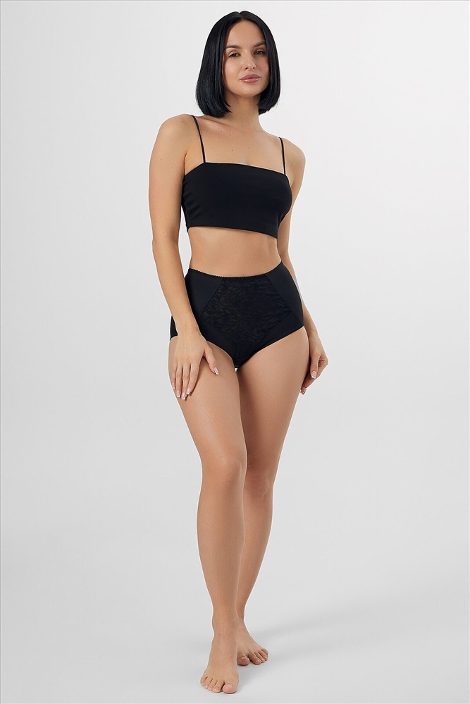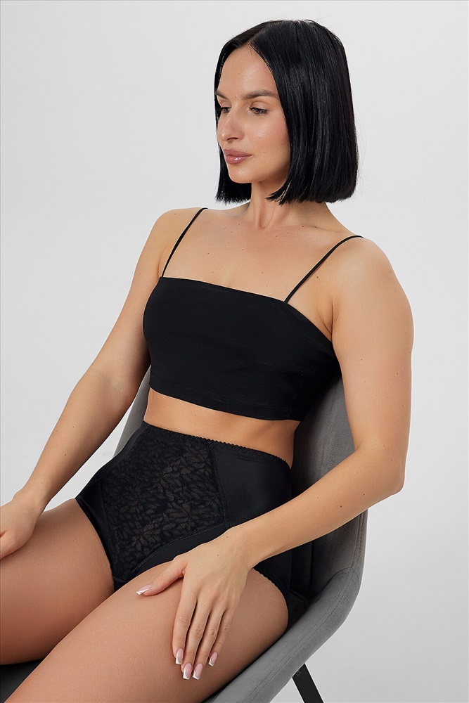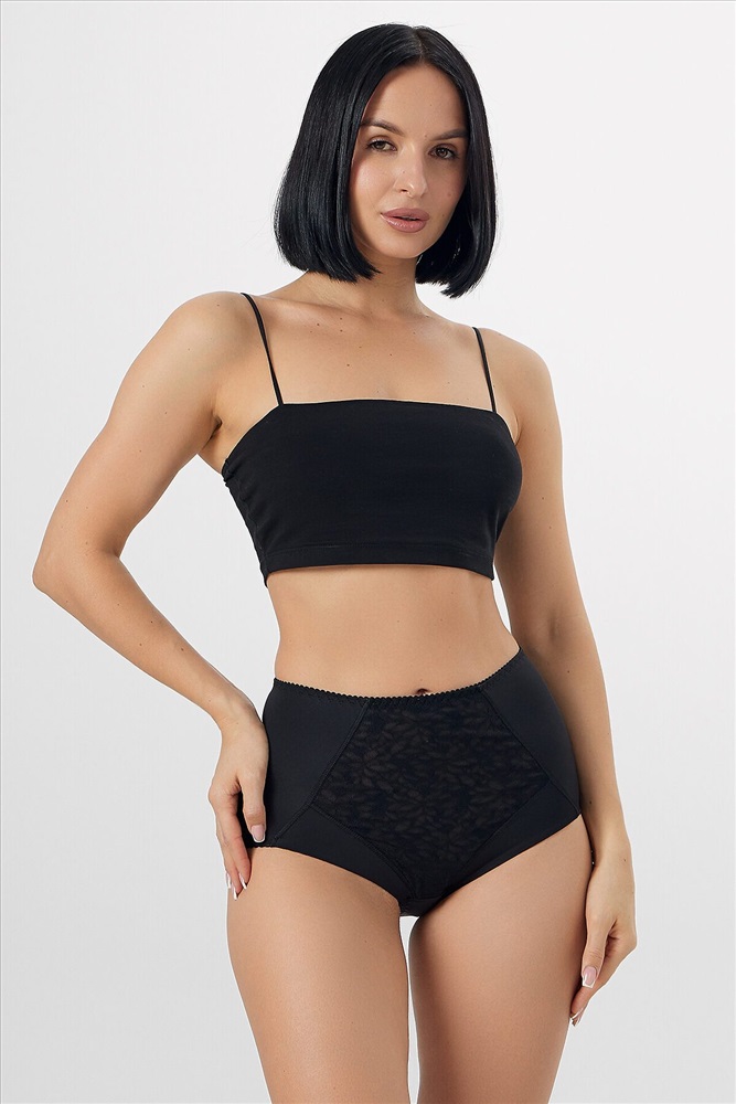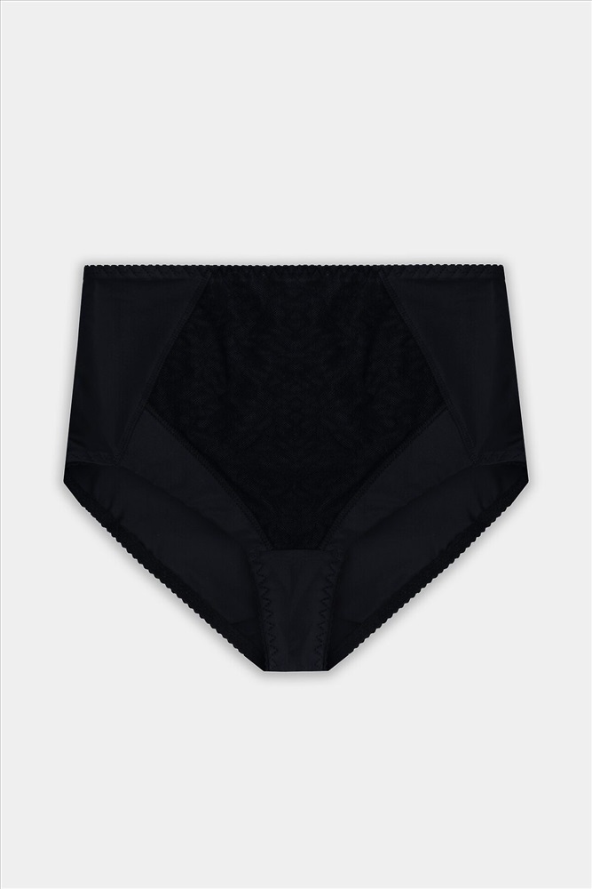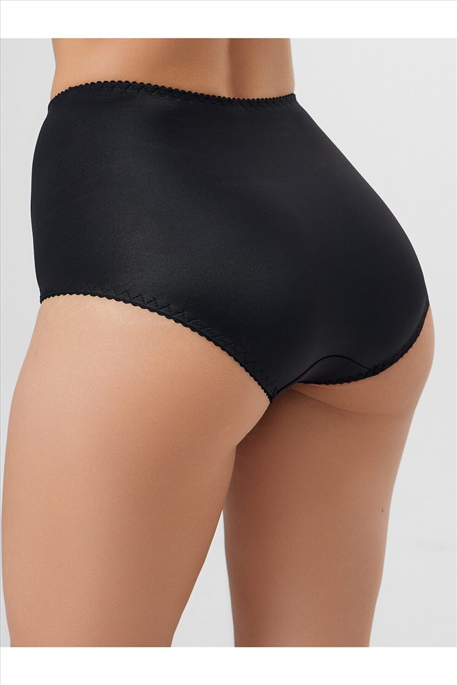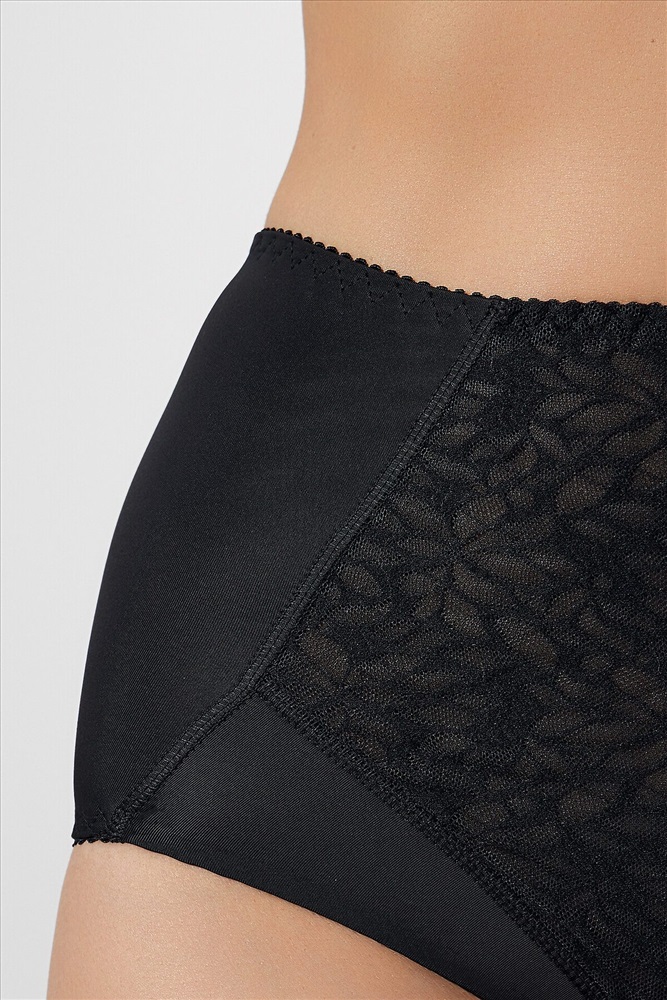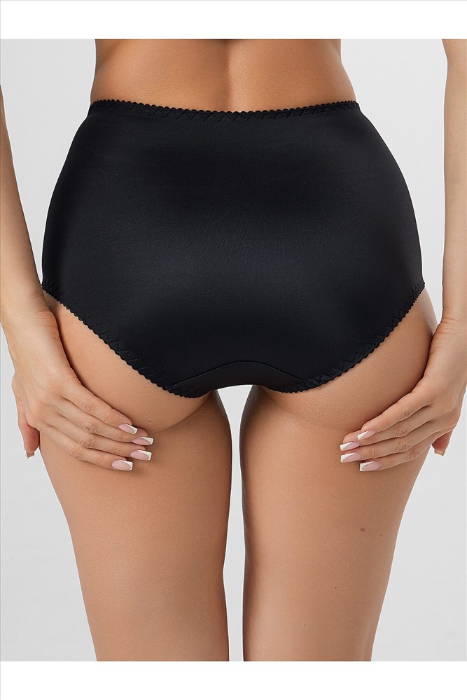 Трусы женские, силуэт макси, выполнены из трикотажного полотна микрофибра. Передняя деталь в центре декорирована кружевным полотном, на подкладке из монокапрона. Нижние детали переда двойные. Внутри по ножкам стоит эл тесьма 6мм (жилка Wt4-6, девсел 13460W). Подкладка ластовицы выполнена из кулирного полотна. Швы передних деталей, ластовицы обработаны на плоскошовной машине с верхним застилом. Срезы по ножкам зад. дет., ластовице обработаны эл. тесьмой с зубом 10мм (жесткая c/з WTE1-10 devsel 558W ) зигзагообразной строчкой. По верхнему срезу эл. тесьма 12мм (жесткая с/з WTE1-12, devsel 558W).