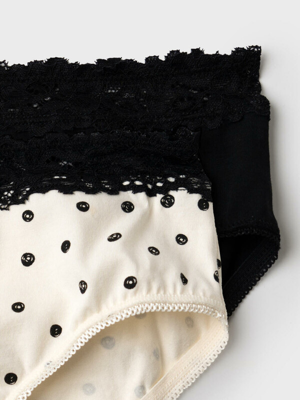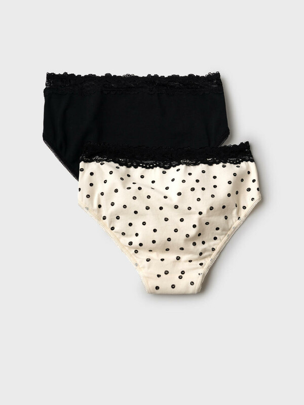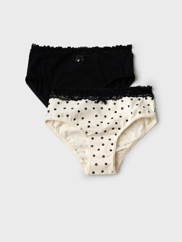 Набор из двух трусов-брифов для девочки подростка. Один вариант выполнен в классическом черном цвете, второй — в нежном кремовом в черный горох. Пояс украшен широкой чёрной кружевной резинкой с цветочным узором. В центре пояса — маленький бантик из атласа с декоративным кристаллом. Вырезы для ног отделаны декоративной эластичной тесьмой. Внутри — хлопковая ластовица для комфорта.
