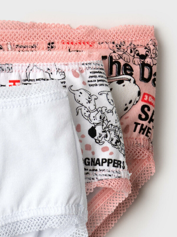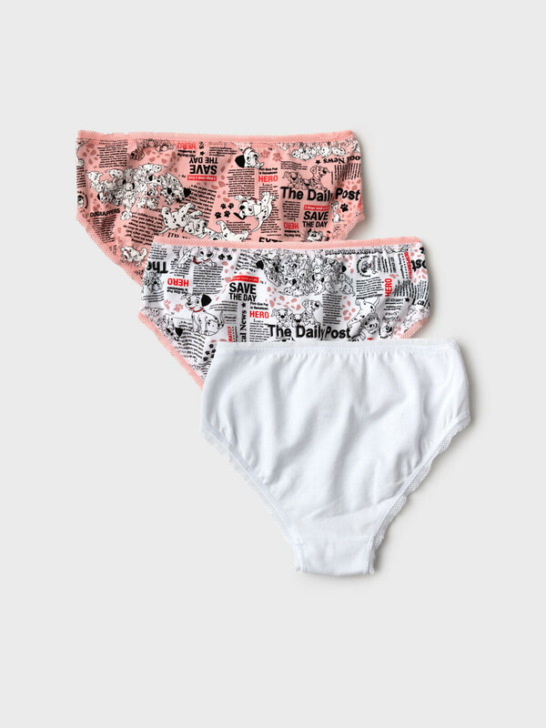 Набор из трех детских трусов-брифов для девочки. Изделия выполнены из мягкого, хлопкового эластичного трикотажа, с широкой резинкой по поясу и окантовкой по вырезам для ног. Принт с любимыми героями мультфильма "101 далматинец". Внутри предусмотрена ластовица.