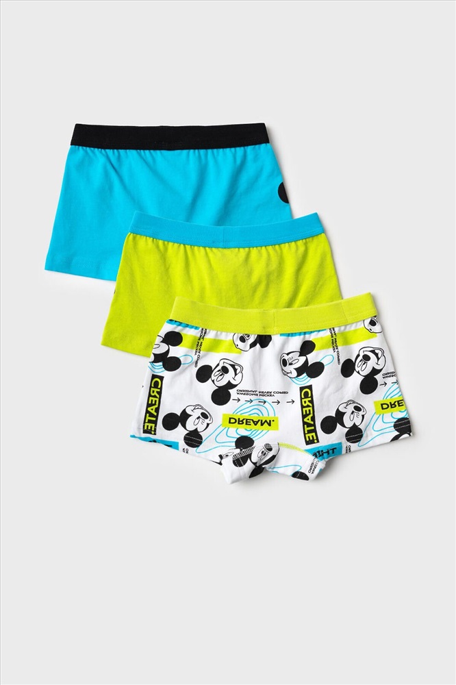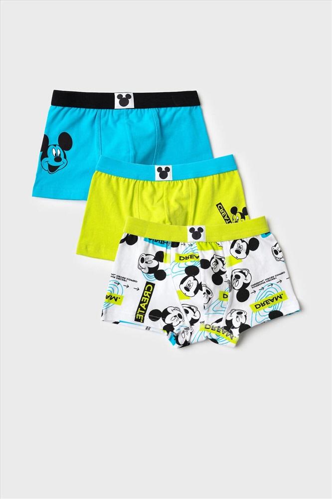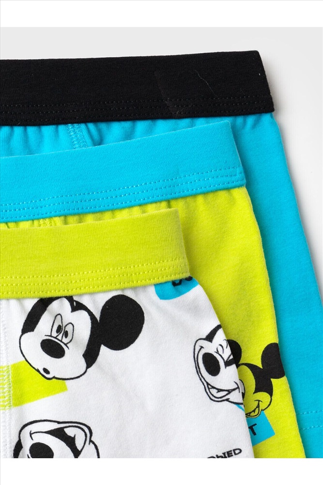 Набор из трех детских трусов-боксеров для мальчика. Изделие плотно прилегает к телу, не имеет боковых швов, что делает его особенно комфортным. Эластичный пояс с логотипом бренда обеспечивает надёжную посадку. Принт с любимым мультяшным героем - Микки Маус. Материал — мягкий хлопковый трикотаж, приятный к телу.