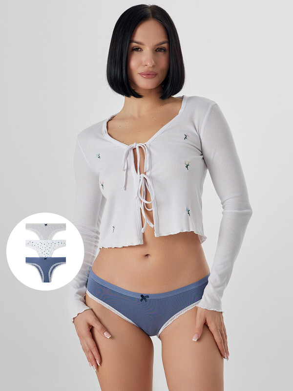 Стильный набор женских трусиков слипов разных цветов из высококачественного хлопка - популярная модель женского белья. Невероятно удобные, благодаря своей невысокой посадке, они пользуются заслуженной любовью покупательниц. Изготовлены из натурального материала, дышащего, мягкого, гипоаллергенного - идеального для повседневной носки. По поясу и ножкам - нежная кружевная лента. Помимо длительного и полного ощущения комфорта, материал отличается долговечностью и сохраняет вид даже после многочисленных стирок. Цвет трусиков останется ярким, рисунок не поблекнет и долго будет радовать вас. Продуманная анатомическая конструкция, плоские швы и деликатные резиночки делают эту модель подходящей для спорта и на каждый день.