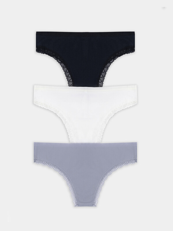Набор из трех женских трусов-слипов в разных цветах — это идеальное сочетание комфорта и изящных деталей. Модели с невысокой посадкой выполнены из мягкого хлопка с добавлением эластана, который обеспечивает нежное облегание и свободу движений. Изящная кружевная лента по поясу и ножкам добавляет образу женственности, оставаясь комфортной в носке.