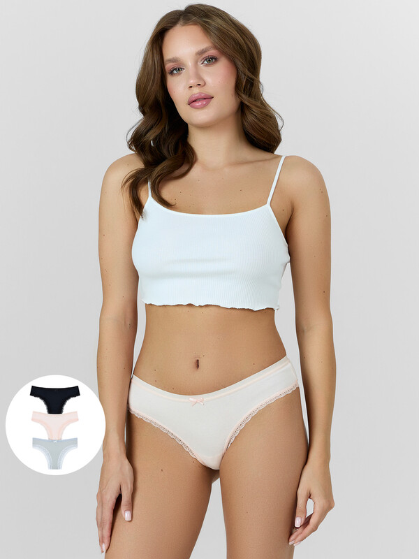 Производитель: Mark Formelle Мультипак (3 штуки) хлопковых слип-бикини из натурального, гипоаллергенного, дышащего полотна. Линия талии невысокая. По поясу и ножкам – нежная кружевная лента. Отличный повседневный вариант в базовой расцветке!