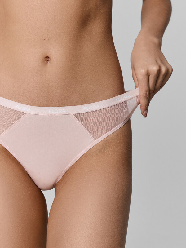 Трусы женские, средняя линия талии, силуэт - липы. Передняя и задняя центральные детали выполнены из хлопка. Боковые детали из сетки (без боковых швов). Верхний срез трусов обработан жилкой. Нижние срезы трусов обработаны жилкой 6мм. Верхний срез подкладки ластовицы отлетной.