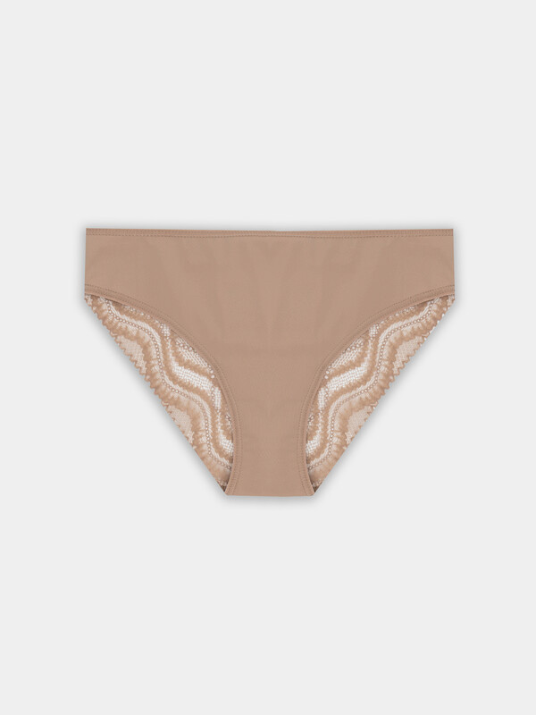 Комфортные слип-бикини из невесомой микрофибры и ажурного эластичного кружева на задней детали. Посадка по талии слегка занижена. На верхнем срезе и по ножкам – эластичная тесьма. Стильные трусики!