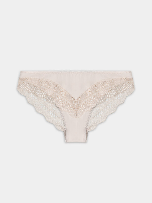 Слип-бикини базовой расцветки из хлопкового трикотажа и вставками из элегантного кружева по нижнему срезу. Линия талии чуть ниже классической. По поясу трусики окантованы эластичной тесьмой. Отличная модель со своей изюминкой!