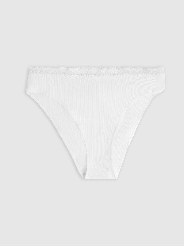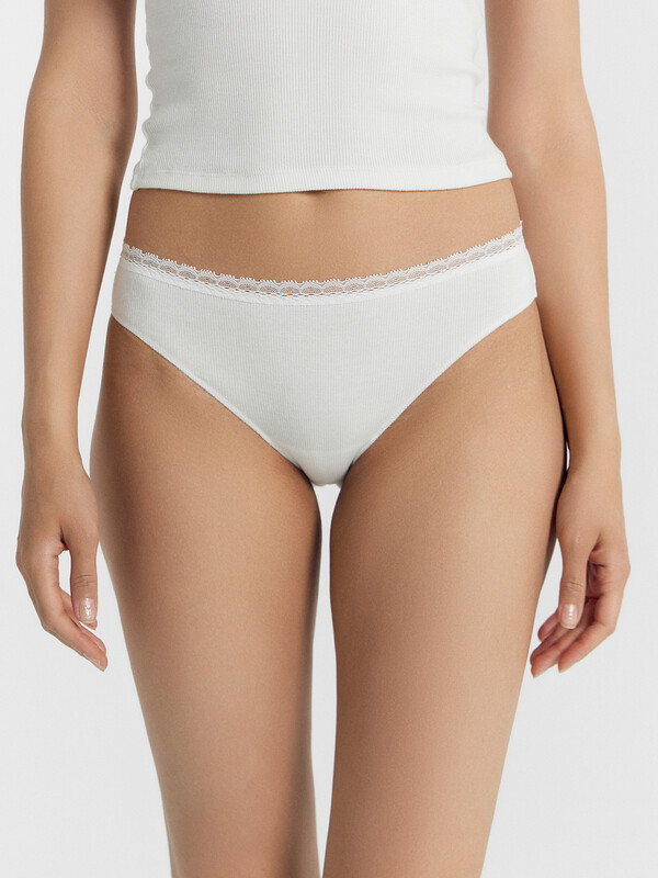 Женские классические трусики со средней линией талии. Выполнены из трикотажной рибаны – в рубчик. Верхняя часть окантована узким кружевом. Рекомендуем!