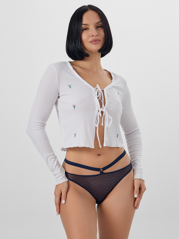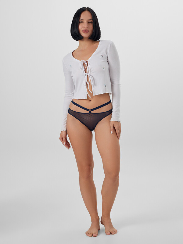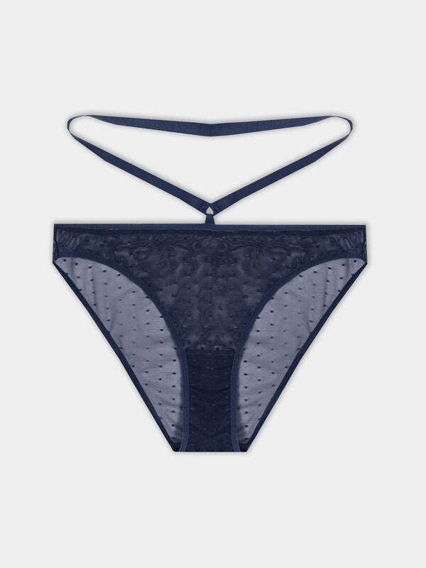 Трусы женские классического силуэта со средней посадкой из эластичной сетки. Передняя и задняя детали цельные. Подкладка ластовицы из кулирной глади, настрочена по переднему краю. По центру к передней детали прикреплена через кольцо декоративная эластичная тесьма. Талия и ножки обработаны эластичной тесьмой по лицевой стороне (жилка).