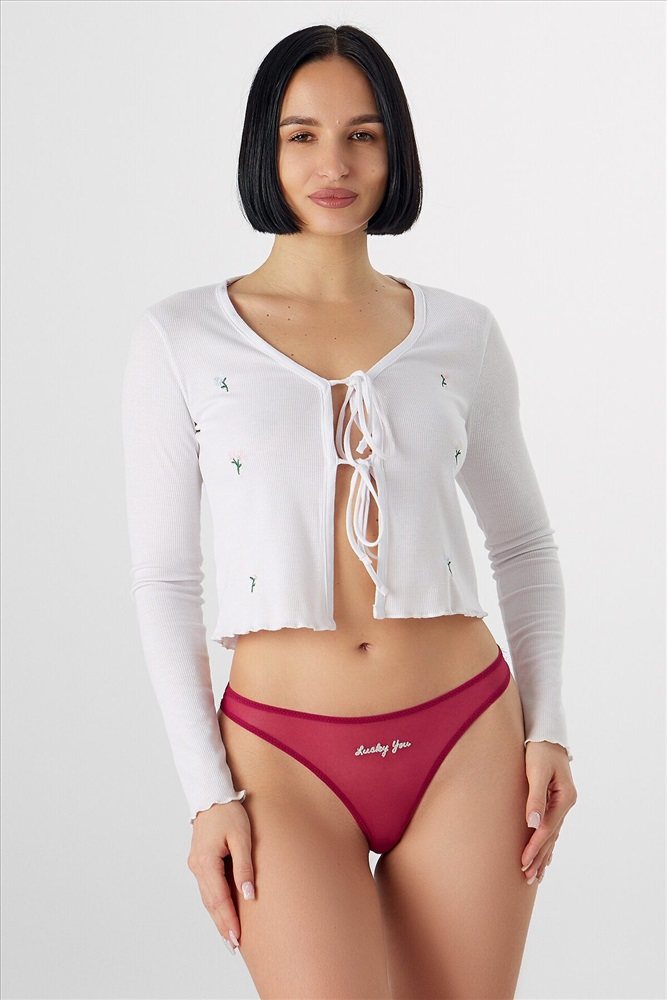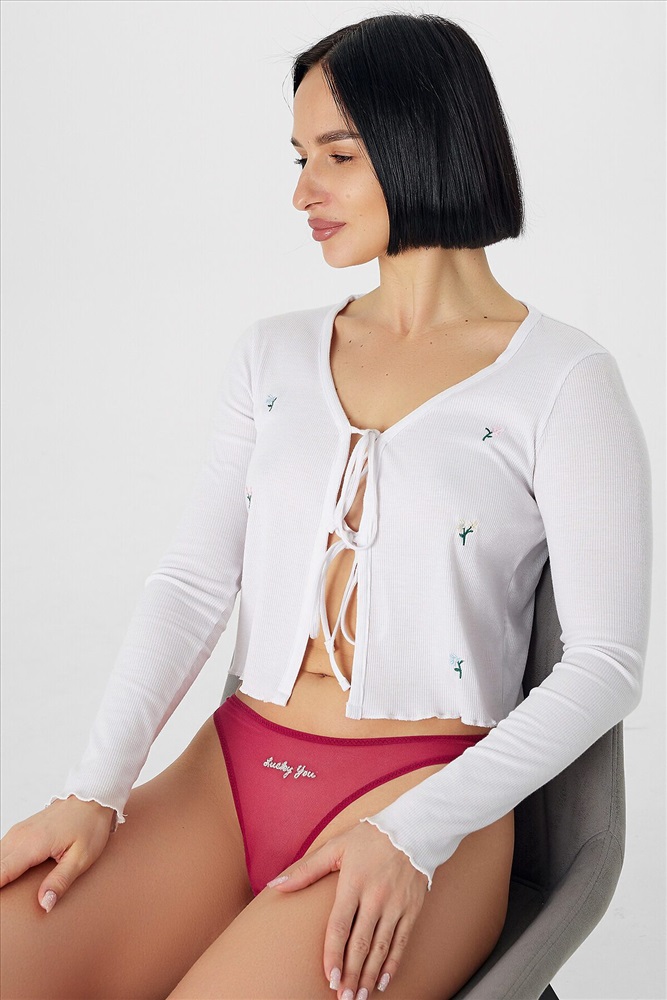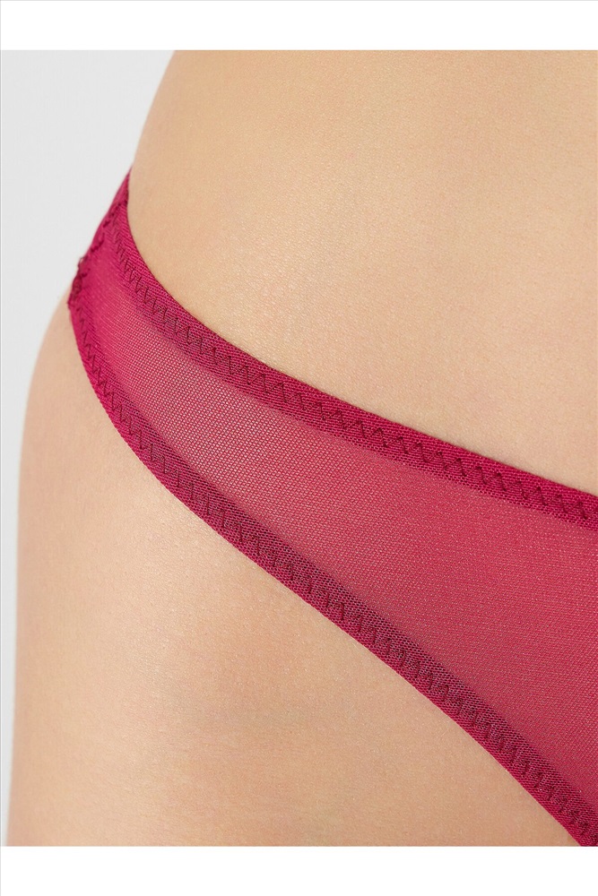 Трусы женские бразилиано с высокой посадкой из кружевного полотна. Передняя деталь цельнокроенная с ластовицей, подкладка ластовицы из кулирной глади настрочная по верхнему краю. Талия и ножки обработаны в два приема жилкой.
