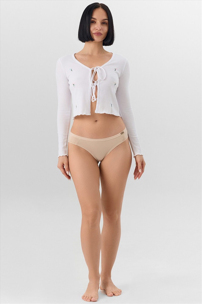 Состав с преобладанием хлопка и добавлением эластана сохраняет форму после стирок, обеспечивая идеальную посадку и мягкое облегание фигуры. Универсальный бежевый цвет и лаконичный дизайн делают эти трусы незаметными под облегающей одеждой. Практичный выбор для тех, кто ценит комфорт, качество и естественность в деталях нижнего белья — они подчеркнут вашу естественную красоту без лишних деталей.