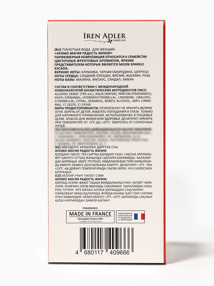 Габариты: 11,5 x 5,5 x 4 Страна: Россия В боксе: 24 шт Состав: См. на упаковке Материалы: см. на упаковке Фасовка: по 1 шт Индивидуальная упаковка: Без упаковки Сертификат: ЕАС Для кого: Для женщины Объём, мл: 30 Группа ароматов: Фруктовые, Цветочные Верхние ноты: Клубника, Смородина, Цитрусовые ноты Средние ноты: Фрезия, Роза, Сладкий горошек, Жасмин Базовые ноты: Мускус, Амбра, Сандал/Сантал, Малина Вид дозатора: Распылитель Туалетная вода женская Аромо Магия Радость Жизни, 30 мл — это яркий, лёгкий и праздничный аромат для женщин, которые любят радость, свободу и позитивное настроение. Вдохновлённая композицией Moon Sparkle (Escada), эта туалетная вода сочетает сочные фруктовые акценты, воздушные цветочные ноты и мягкую сладкую базу, создавая игривый, сияющий и незабываемый шлейф. Композиция открывается яркими нотами спелого апельсина, личи и грейпфрута, которые дарят ощущение свежести, радости и бодрости. Это лёгкое и солнечное начало мгновенно поднимает настроение и создаёт атмосферу праздника. В сердце аромата раскрываются пионы, магнолия и фрезия, добавляя композиции нежности, романтичности и лёгкой цветочной воздушности. База построена на мягких акцентах мускуса и древесного амбрового шлейфа, которые делают аромат стойким, обволакивающим и тёплым. Он оставляет после себя лёгкий, сияющий след, который подчеркивает женственность и лёгкость характера. Для максимального эффекта наносите туалетную воду на точки пульса — запястья, шею, область за ушами. Так аромат раскрывается полностью, создавая радостный, игривый и привлекательный шлейф. Преимущества Аромо Магия Радость Жизни, 30 мл: