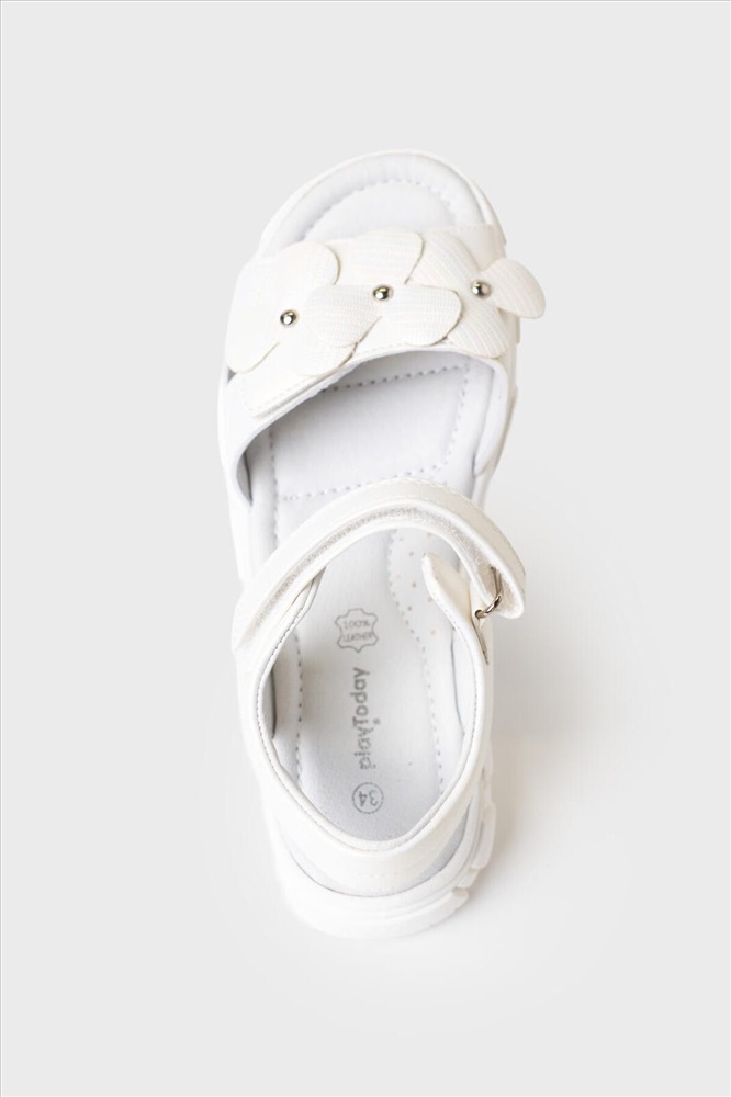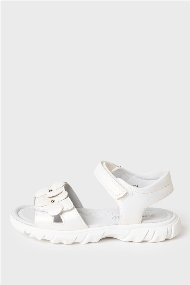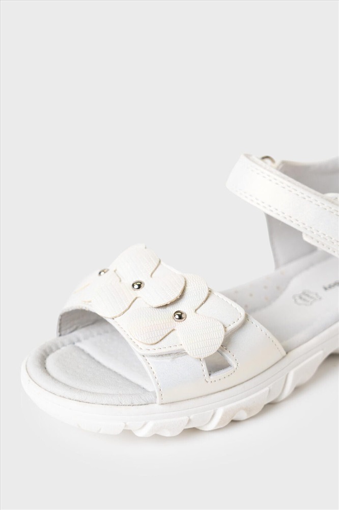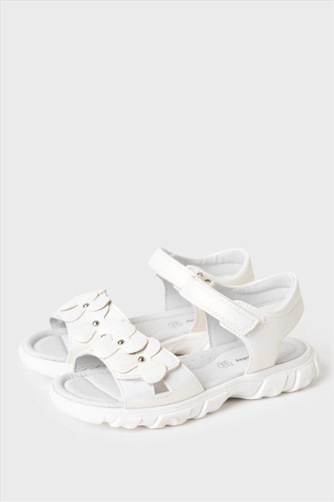 Нарядные белые сандалии для девочки. Босоножки выполнены из перламутровой искусственной кожи и декорированы крупными цветами. Удобные ремни с липучками позволяют регулировать обувь на любой подъем. Подкладка и стелька выполнена из натуральной кожи. Стелька имеет анатомический элемент для поддержания свода стопы в правильном положении. Модель имеет гибкую и легкую подошва из ТПР с противоскользящим протектором.