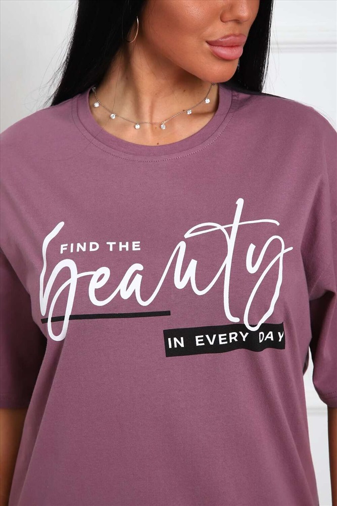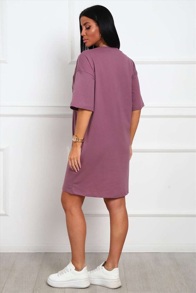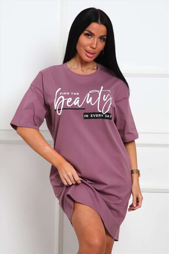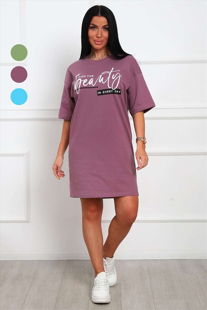 Туника женская прямого силуэта. Низ изделия прямой. Длинна выше колена, плечо спущенное, рукав короткий. Горловина круглой формы, обработана планкой с отделочной строчкой по шву притачивания. Принт (шелкография) располагается по центру переда.