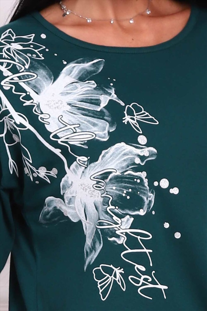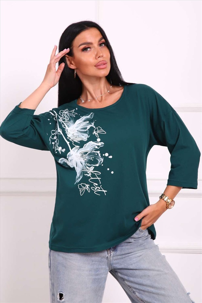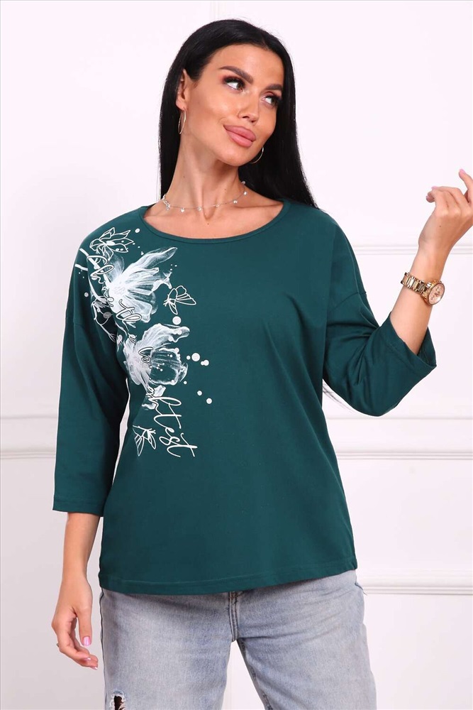 Туника женская. Ткань кулирка, хлопок 100%. Крой свободный, горловина круглой формы, обработана окантовкой. Линия плеч спущена. Длинна рукава 3/4, со швом по локтю. Низ изделия прямой. На полочке принт, шелкография.