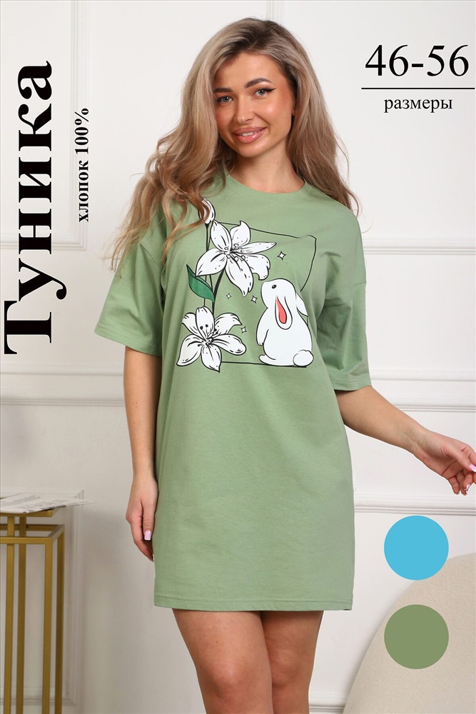 Туника женская прямого силуэта. Низ изделия прямой. Длинна выше колена, плечо спущенное, рукав короткий. Горловина круглой формы, обработана планкой с отделочной строчкой по шву притачивания. Принт (шелкография) располагается по центру переда.