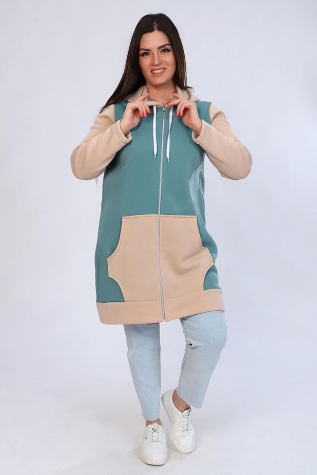 Женская комбинированная туника прямого силуэта на молнии, с капюшоном на шнуровке через люверсы. Длинный рукав на манжете. Карман кенгуру. Теплая и удобная. Рост модели на фото 165см, размер 48