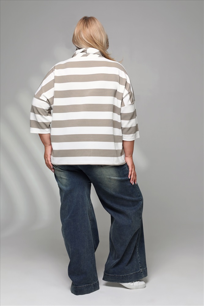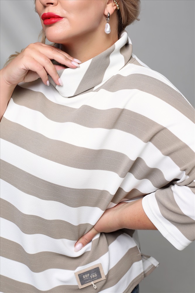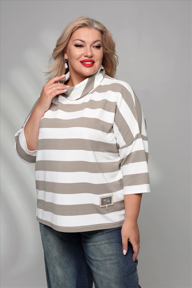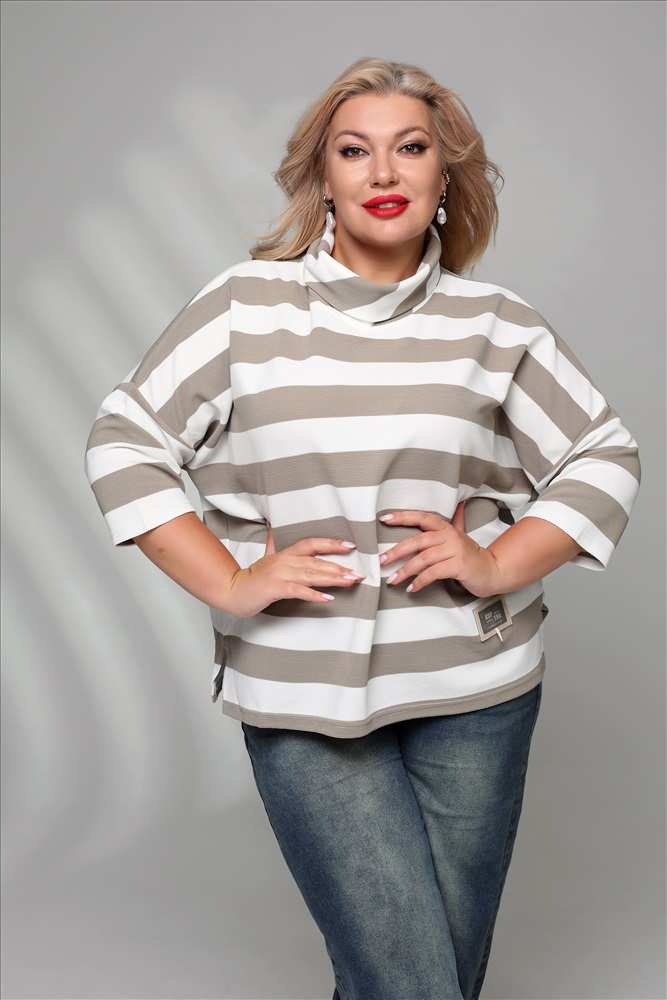 Цвет: Белый, Бежевый Фасон: Туника Материал: Трикотаж Длина рукава: Длинный рукав Параметры модели: Рост 173 см, Размер 54 Туника с хомутом "горизонтальные полосы" бежево-белая
