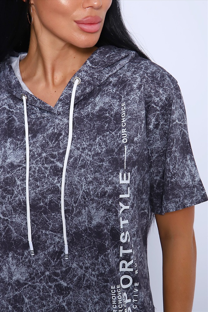Женская туника из легкого трикотажного материала тонкого хлопка - кулирки. Свободная, спортивная, с капюшоном, объем которого регулируется атласной лентой контрастного цвета. Тунику вполне можно использовать как летний вечерний костюм, как повседневный домашний наряд или как легкое праздничное или офисное платье. Благодаря свободному крою, туника отлично подойдет полным и пышным женщинам, беременным девушкам и кормящим мамам. Рисунок ткани имитирует вареную джинсовку, актуален всегда и придает изделию особый шик. Карманы спрятаны в боковых швах для вашего удобства.