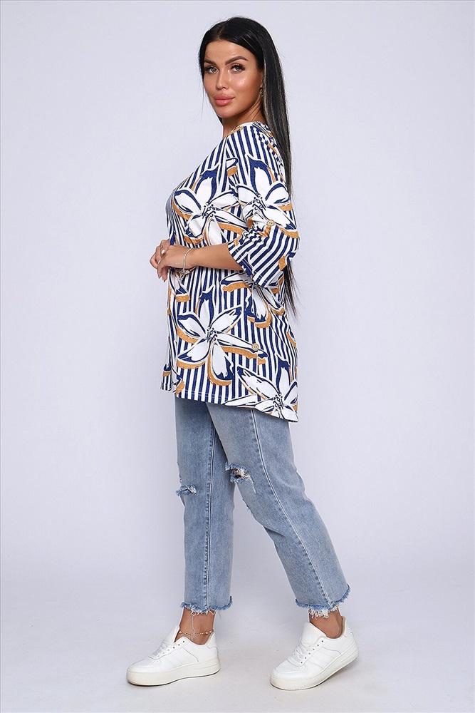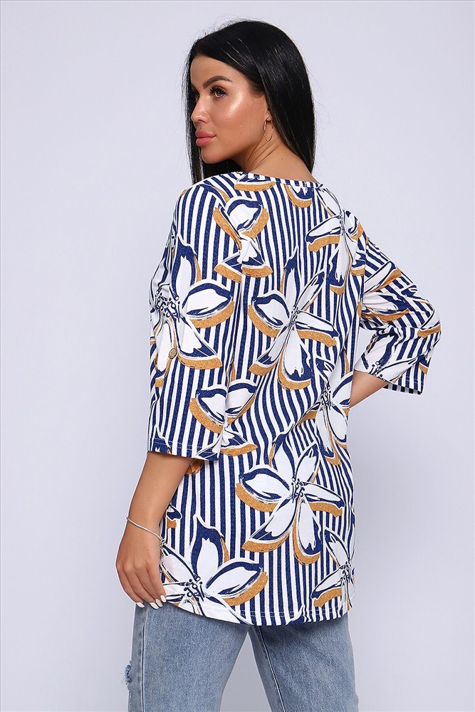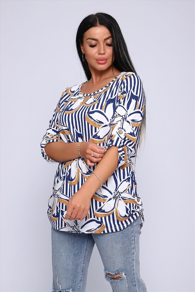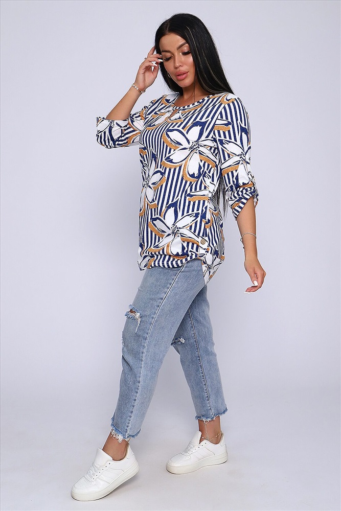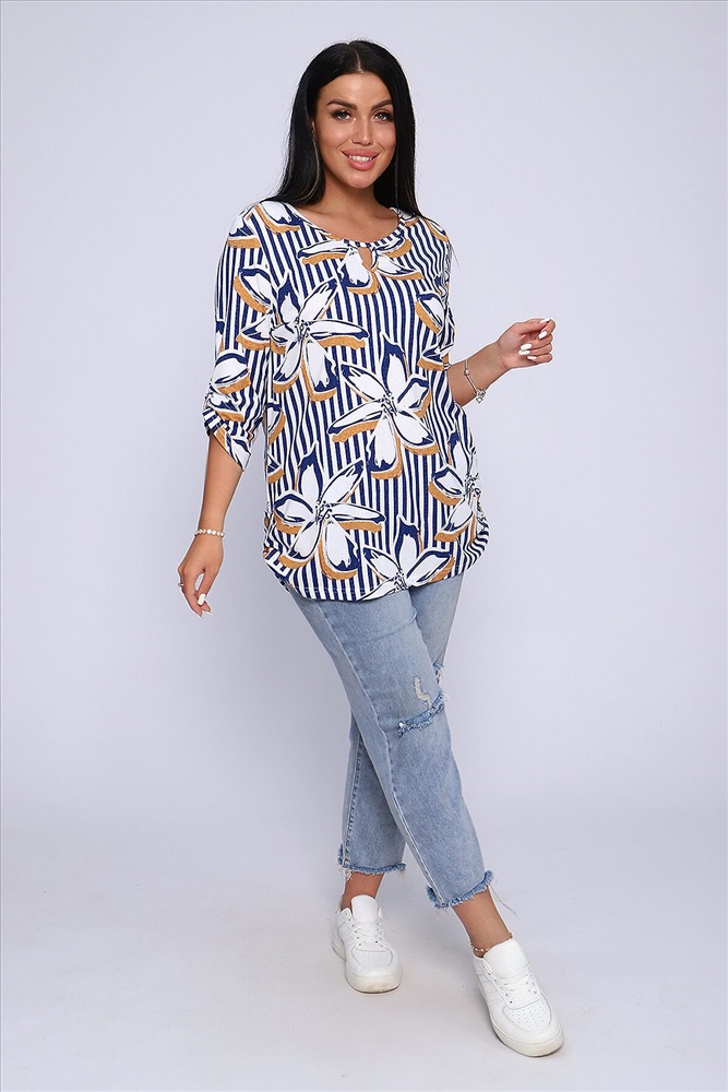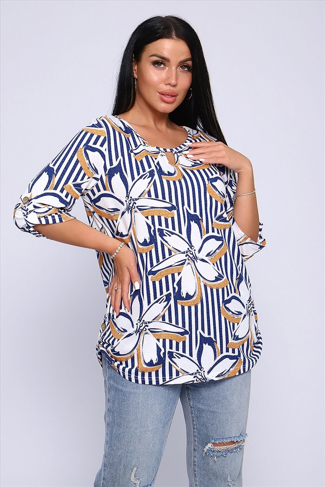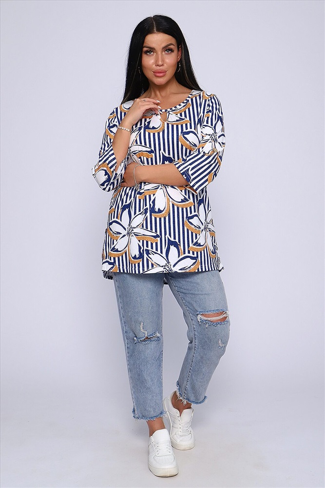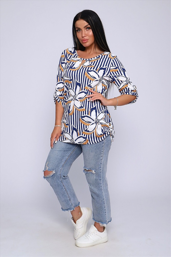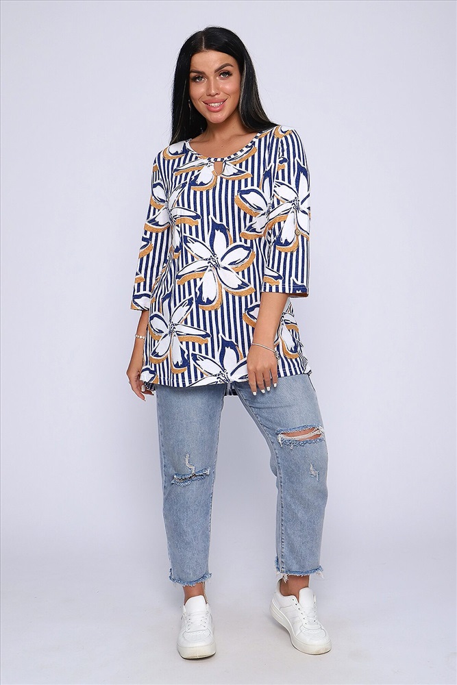 ID товара: 905178 Состав: 100% Хлопок Сезон: Весна/Лето Длина: Средняя Фасон: Свободный крой Рукав: До локтя Вырез горловины: Округлый Рисунок: цветочный Основная ткань: Хлопок Стиль: Повседневный Вид ткани: Кулирка Страна бренда: Россия Страна производства: Россия Женская блуза - туника с рукавом 3/4 с фигурным вырезом с окантовкой из основной ткани. Длина рукава регулируется патой на пуговице. Такая же регулировка находится по бокам изделия. Можно носить как с опущенной патой, так и собранной на декоративную пуговицу. Низ изделия закруглен, перед немного укорочен. Блузка отлично подойдет как для уличного, так и домашнего ношения. Прекрасно сочетается с джинсами на прогулку, с юбками - миди в офис, с домашними брюками для дома и дачи. Большой ассортимент приятных расцветок на любой вкус. Туника прекрасно смотрится на беременных, так как выполнена в свободном стиле. Отличный подарок любимым женщинам! Комментарии к товару