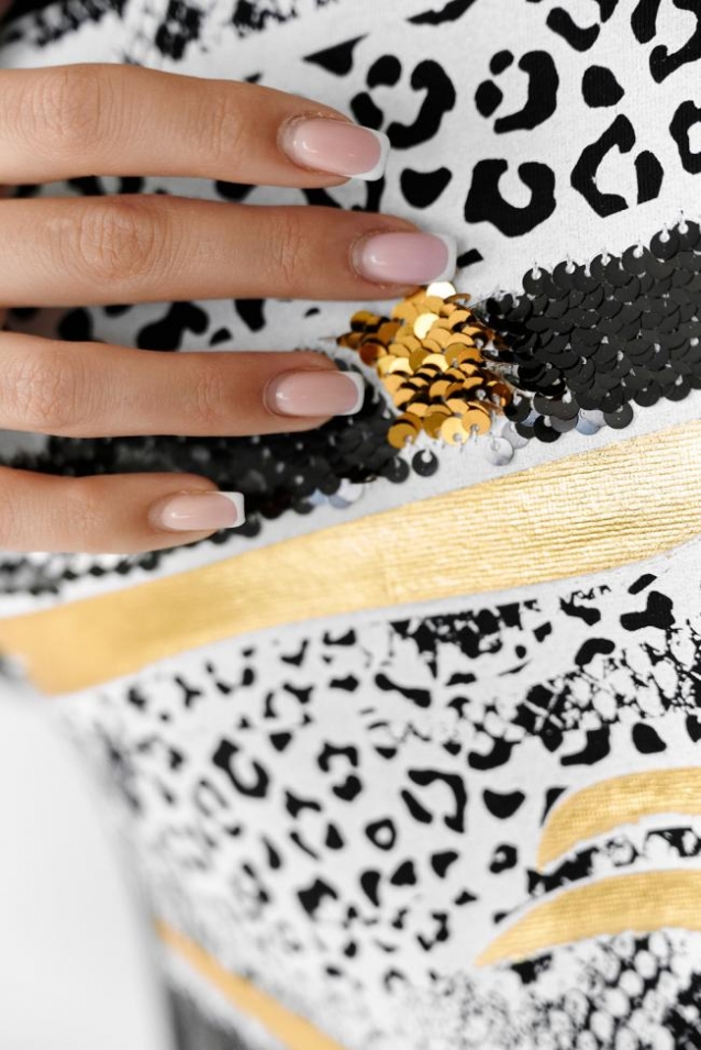 Туника полуприлегающего силуэта, с округлой горловиной, длиной до середины бедра. Рукав втачной, длинный. Горловина обработана бейкой из основного полотна. На полочке большая красивая печать с золотым или серебряным глиттером, декорированная пайетками