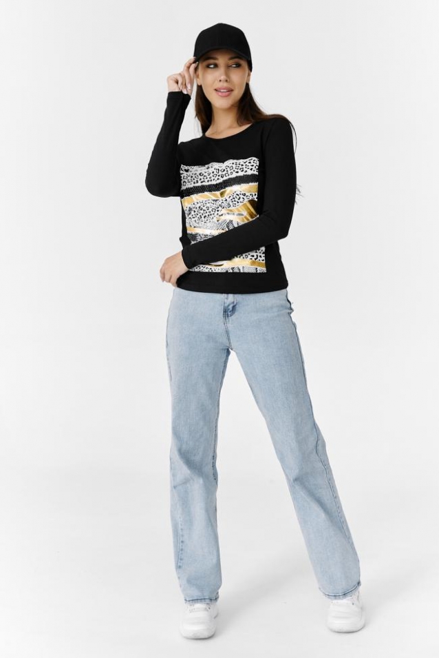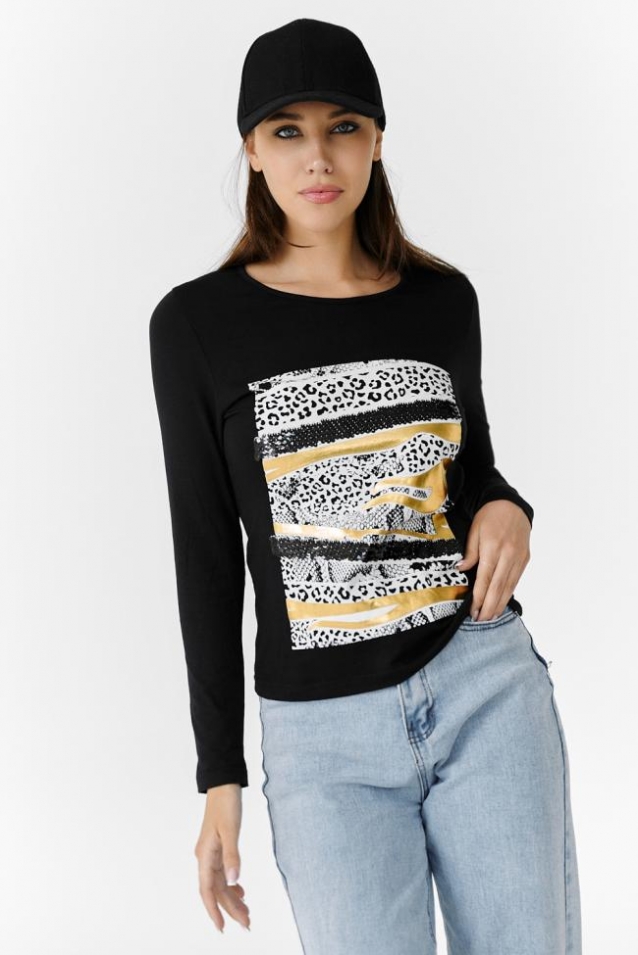 Туника полуприлегающего силуэта, с округлой горловиной, длиной до середины бедра. Рукав втачной, длинный. Горловина обработана бейкой из основного полотна. На полочке большая красивая печать с золотым или серебряным глиттером, декорированная пайетками