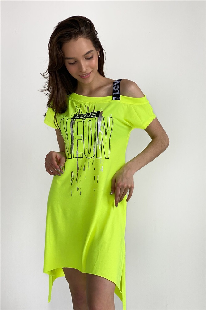 Туника полуприлегающего силуэта, длиной выше колена спереди и удлиненной спинкой сзади, с фигурной линией низа. Рукав цельнокроеный, короткий. В нижней части боковых швов обработаны разрезы. Горловина асимметричная с эластичной бретелью, обработана обтачкой из основного полотна.