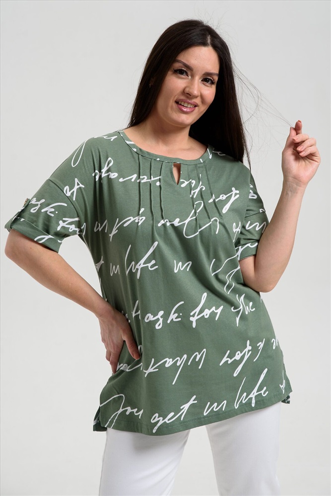 ID товара: 1088065 Состав: 70% Хлопок, 30% Полиэстер Сезон: Весна/Лето Длина: Средняя Фасон: Свободный Рукав: короткие Вырез горловины: Округлый Рисунок: Надпись Декоративные элементы: Принт Основная ткань: Хлопок Стиль: повседневный Вид ткани: Кулирка Страна бренда: Россия Страна производства: Россия Туника прямая, свободная, с округлой горловиной, с удлиненной спинкой. Рукав короткий, с манжетом и хлястом с пуговицей. В верхней части полочки обработаны декоративные защипы. Спинка с кокеткой. В нижней части боковых швов расположены разрезы. Горловина обработана бейкой из основного полотна. Комментарии к товару