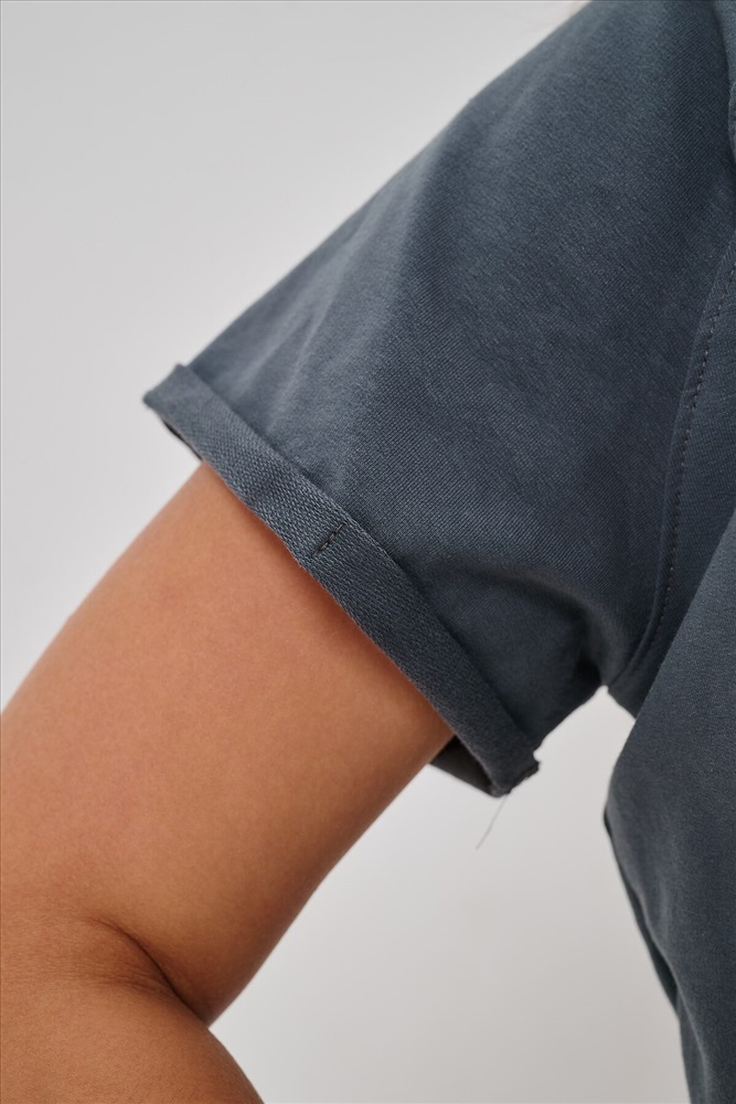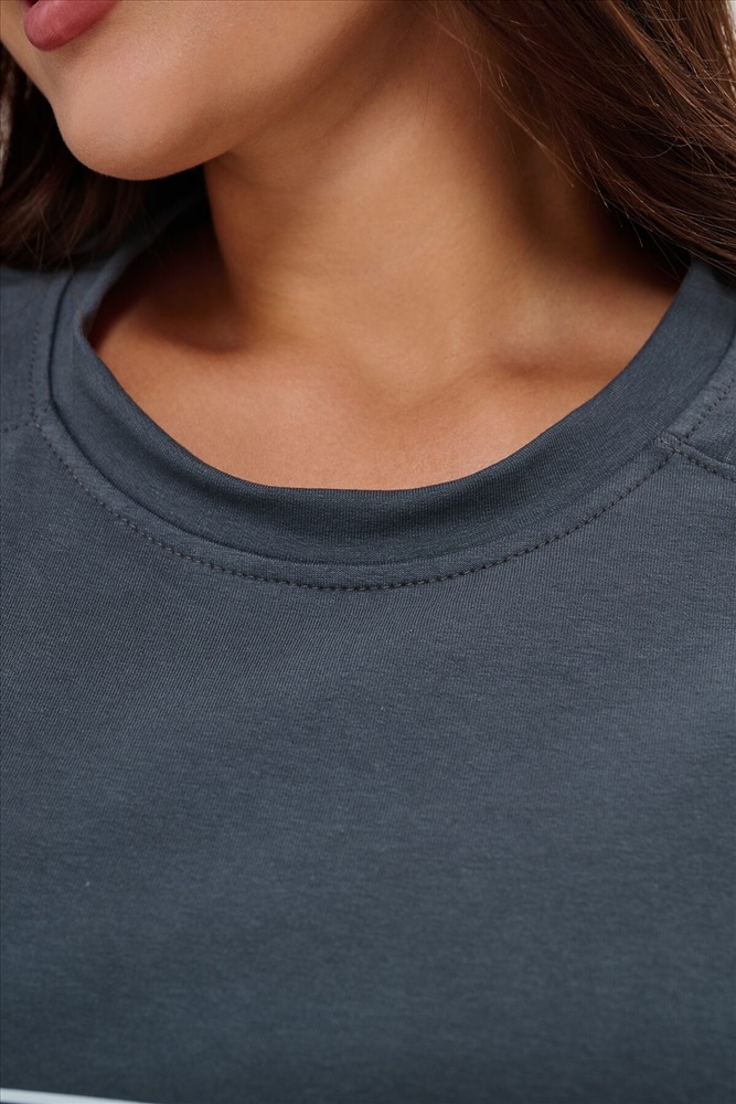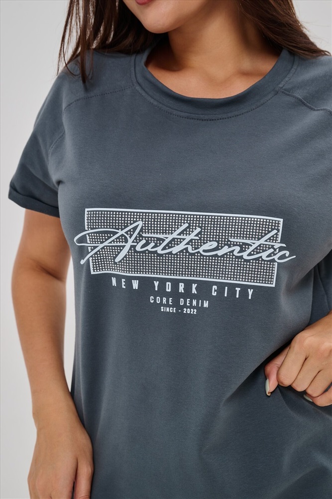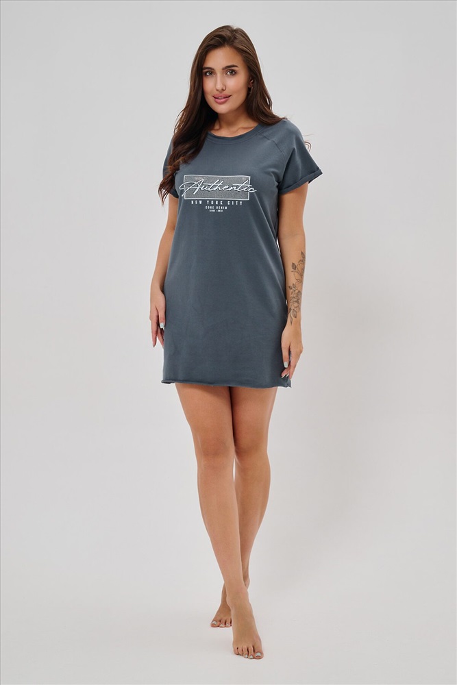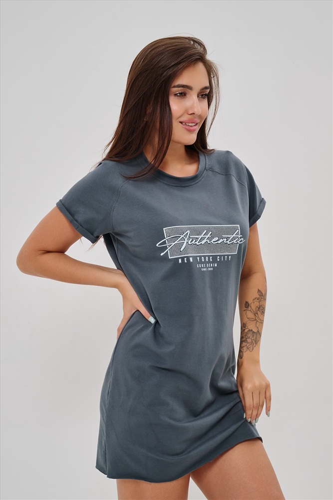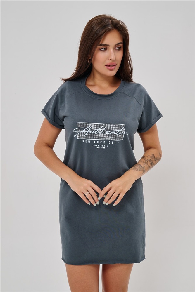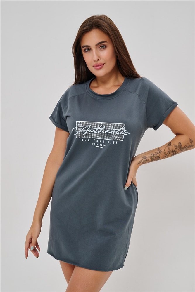 Женская туника-футболка выполнена в лаконичном стиле с прямыми линиями кроя. Ее отличает удобный фасон, подчеркивающий женственность фигуры. Модель оснащена круглым вырезом горловины и короткими рукавами типа реглан, обеспечивающими свободу движений и комфорт. Особенностью изделия является оригинальная отделка низ туники оставлен с необработанными краями, создавая эффект легкой небрежности и современности. Центральное внимание привлекает стильный принт на груди с надписью, украшенный сверкающими стразами, придающий образу дополнительную яркость и шарм.
