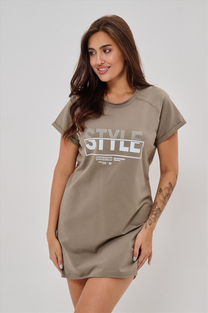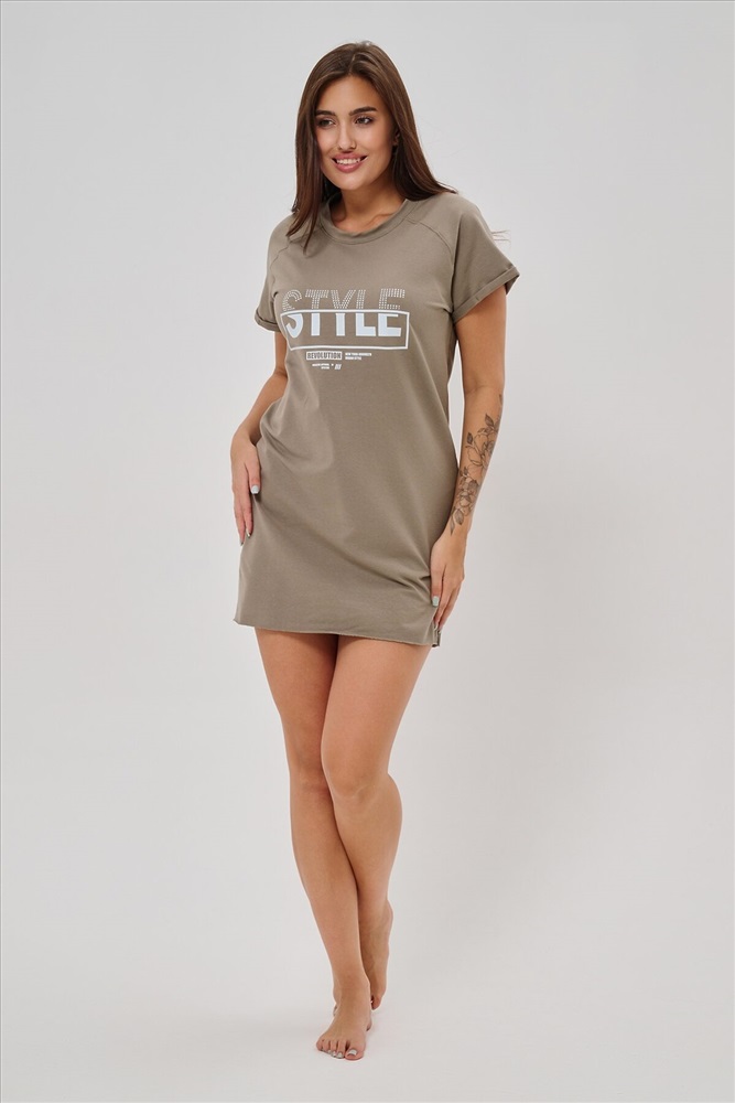 Женская туника-футболка выполнена в лаконичном стиле с прямыми линиями кроя. Ее отличает удобный фасон, подчеркивающий женственность фигуры. Модель оснащена круглым вырезом горловины и короткими рукавами типа реглан, обеспечивающими свободу движений и комфорт. Особенностью изделия является оригинальная отделка низ туники оставлен с необработанными краями, создавая эффект легкой небрежности и современности. Центральное внимание привлекает стильный принт на груди с выразительной надписью STYLE, украшенный сверкающими стразами, придающий образу дополнительную яркость и шарм.