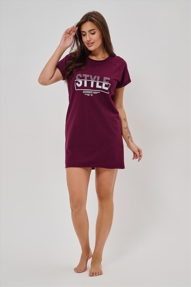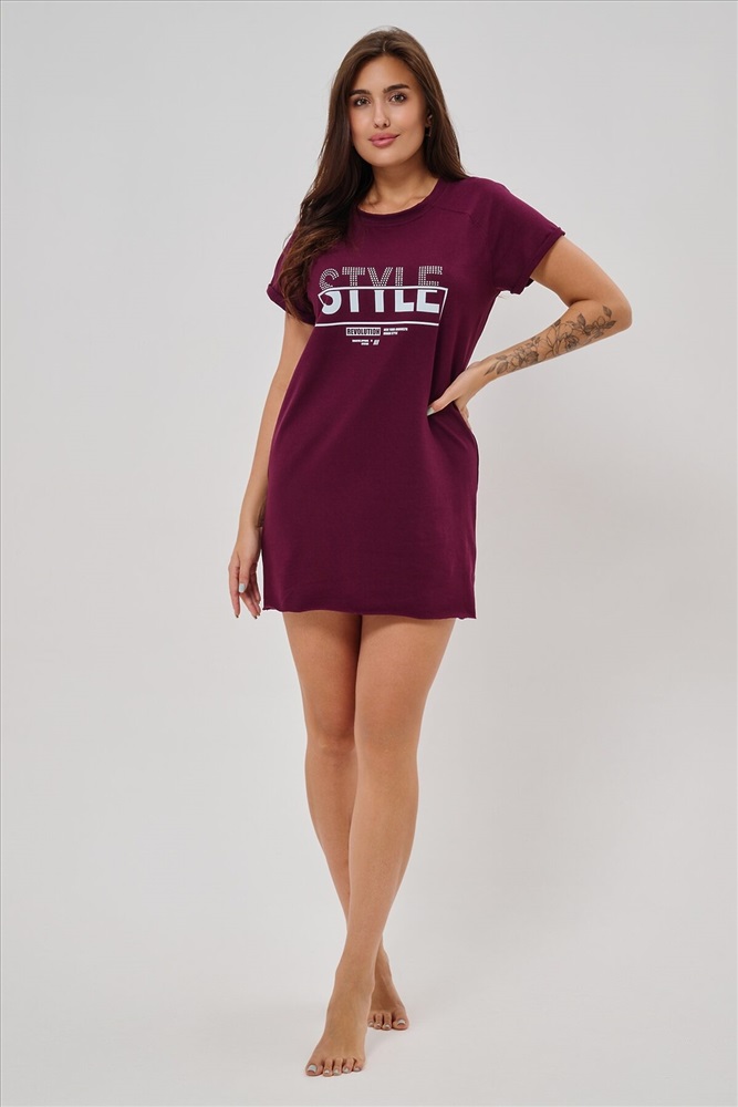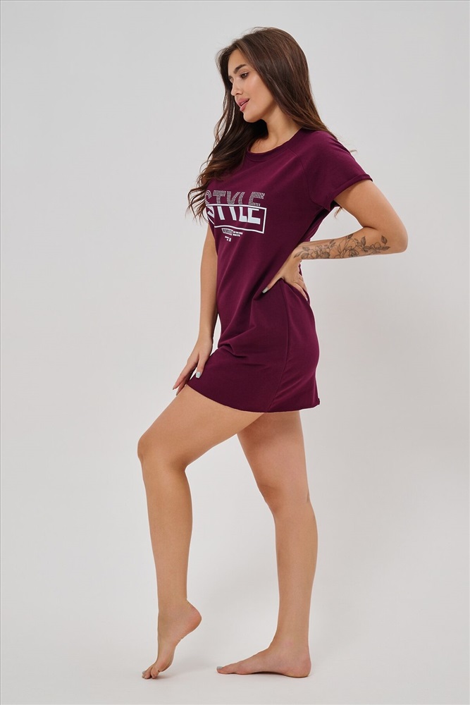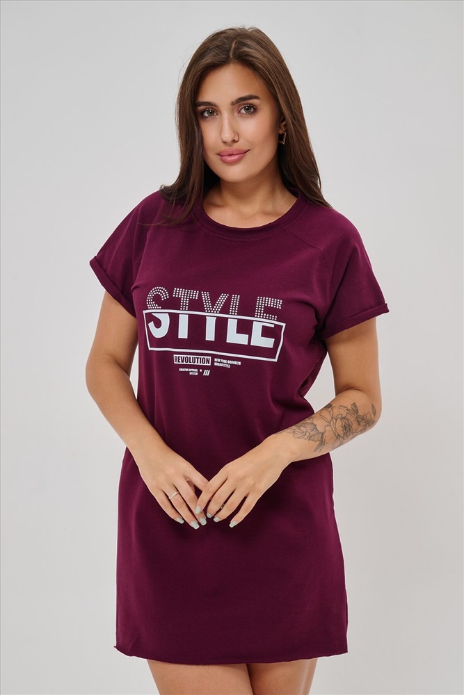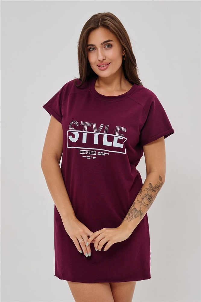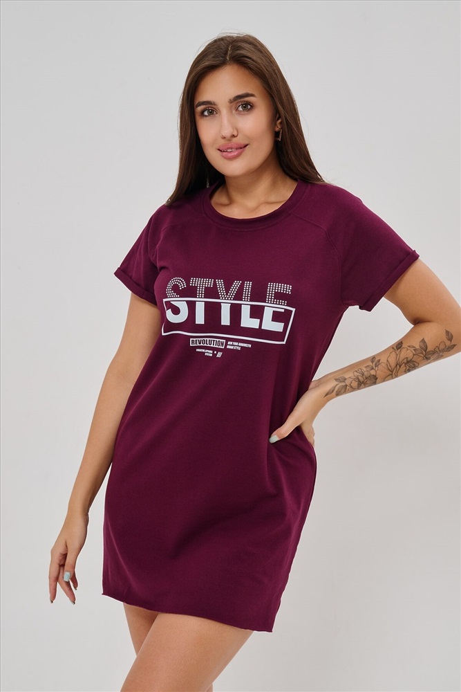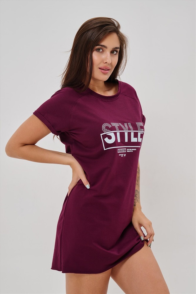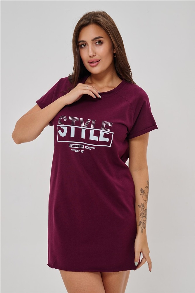 Женская туника-футболка выполнена в лаконичном стиле с прямыми линиями кроя. Ее отличает удобный фасон, подчеркивающий женственность фигуры. Модель оснащена круглым вырезом горловины и короткими рукавами типа реглан, обеспечивающими свободу движений и комфорт. Особенностью изделия является оригинальная отделка низ туники оставлен с необработанными краями, создавая эффект легкой небрежности и современности. Центральное внимание привлекает стильный принт на груди с выразительной надписью STYLE, украшенный сверкающими стразами, придающий образу дополнительную яркость и шарм.