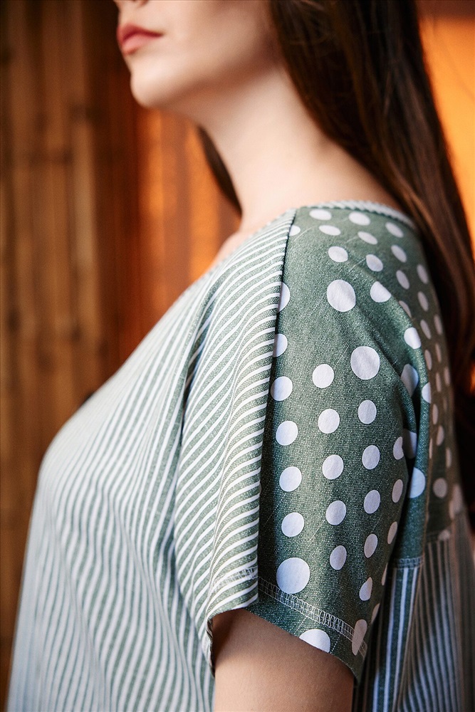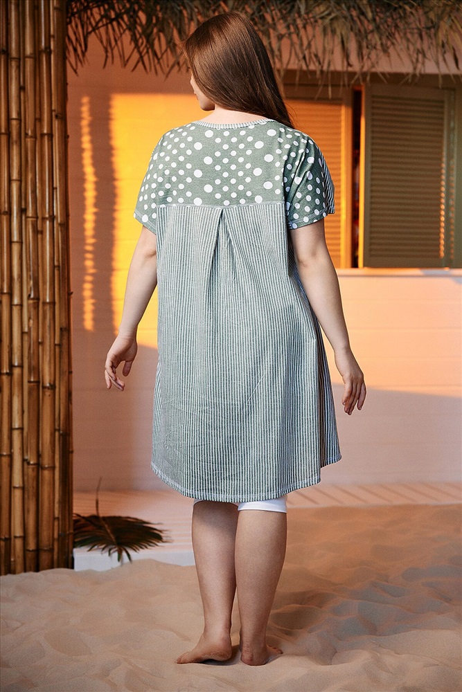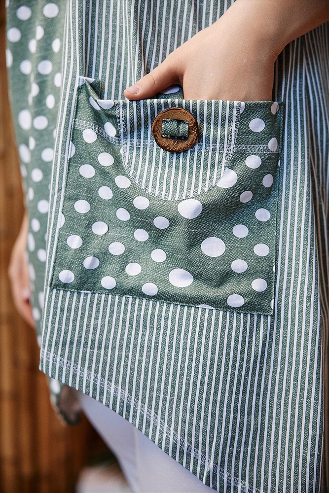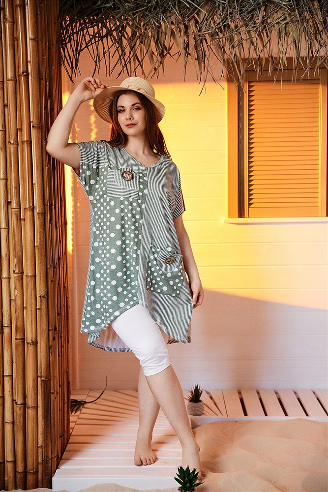 ID товара: 891550 Состав: Хлопок 100% Сезон: Весна/Лето Длина: Удлиненная Фасон: Свободный крой Рукав: короткие Вырез горловины: V-образный Рисунок: Полоски Тип карманов: Накладные Декоративные элементы: Пуговицы Основная ткань: Хлопок Стиль: повседневный Вид ткани: Кулирка Страна бренда: Россия Страна производства: Россия Туника женская, свободная, к низу расширенная. Рукав цельнокроеный короткий. Горловина Y-образная. Туника из двух полочек, одна полочка и кокетка спинки: в горошек, другая полочка, кокетка полочки и спинка: в полоску. На полочке в полоску большой накладной карман из ткани в горошек с декоративной кокосовой пуговицей на вертикальном хлясте. На полочке в горошек нагрудный карман в полоску с хлястом и декоративной кокосовой пуговицей. На спинке сзади складка для обеспечения достаточной свободы по бедрам. Низ туники фигурный, полочка короче спинки. Комментарии к товару