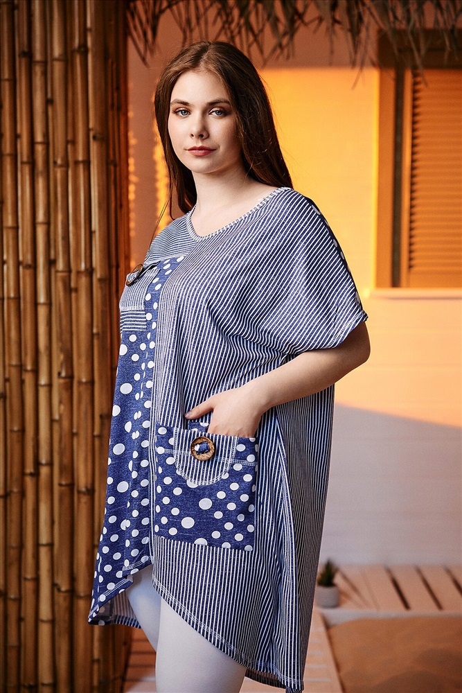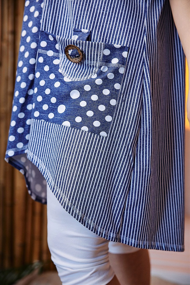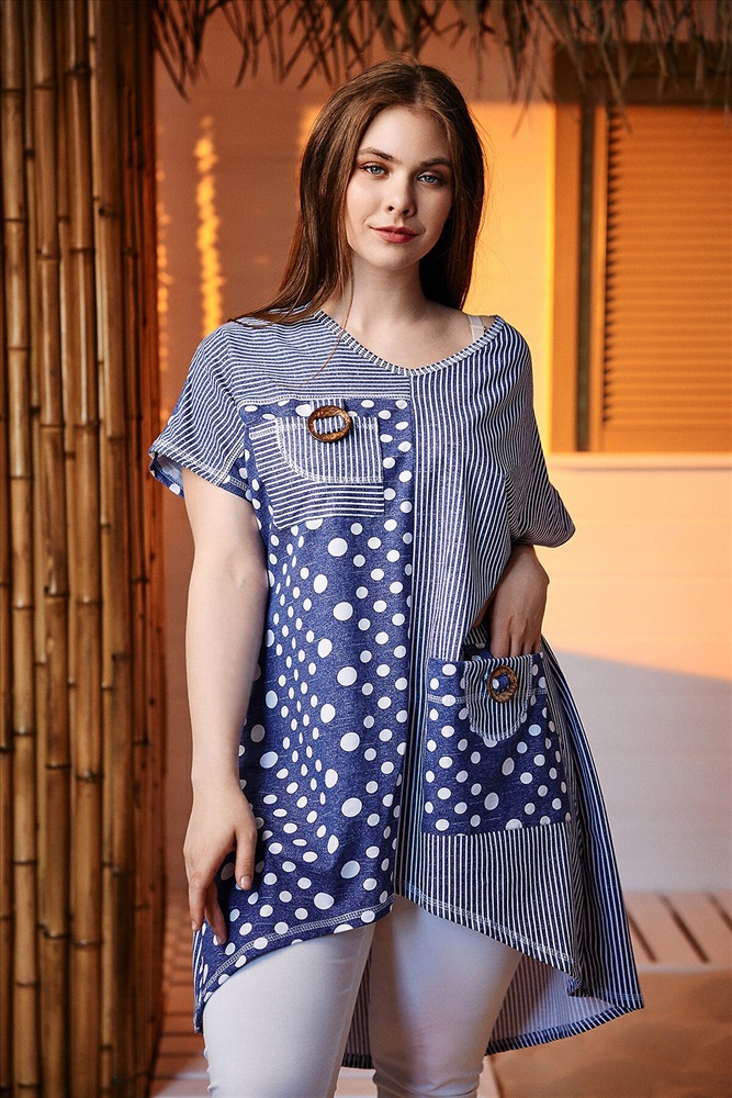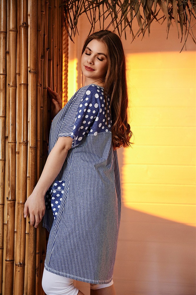 ID товара: 891551 Состав: Хлопок 100% Сезон: Весна/Лето Длина: Удлиненная Фасон: Свободный крой Рукав: короткие Вырез горловины: V-образный Рисунок: Полоски Тип карманов: Накладные Декоративные элементы: Пуговицы Основная ткань: Хлопок Стиль: повседневный Вид ткани: Кулирка Страна бренда: Россия Страна производства: Россия Туника женская, свободная, к низу расширенная. Рукав цельнокроеный короткий. Горловина Y-образная. Туника из двух полочек, одна полочка и кокетка спинки: в горошек, другая полочка, кокетка полочки и спинка: в полоску. На полочке в полоску большой накладной карман из ткани в горошек с декоративной кокосовой пуговицей на вертикальном хлясте. На полочке в горошек нагрудный карман в полоску с хлястом и декоративной кокосовой пуговицей. На спинке сзади складка для обеспечения достаточной свободы по бедрам. Низ туники фигурный, полочка короче спинки. Комментарии к товару