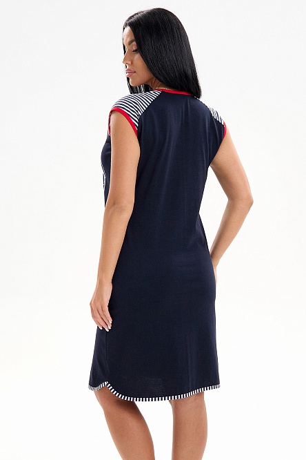 Летняя туника из натуральной ткани предназначена для повседневного ношения, выглядит привлекательно и по-молодежному. Имеет простой фасон и удобную посадку. Модель темно-синего цвета декорирована разноцветным принтом. Округлая горловина, короткие рукава и карманы обработаны кантом красного цвета.