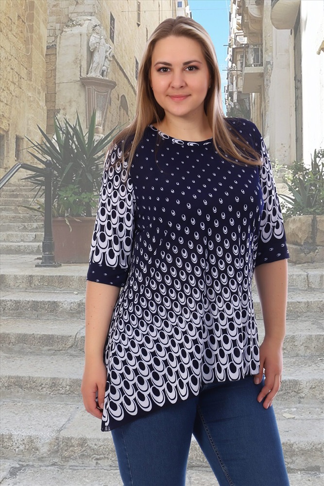 Туника свободного кроя. Вырез горловины отделан кантиком, рукав 3/4 на манжете. Низ изделия асимметричный — удлинен справа.