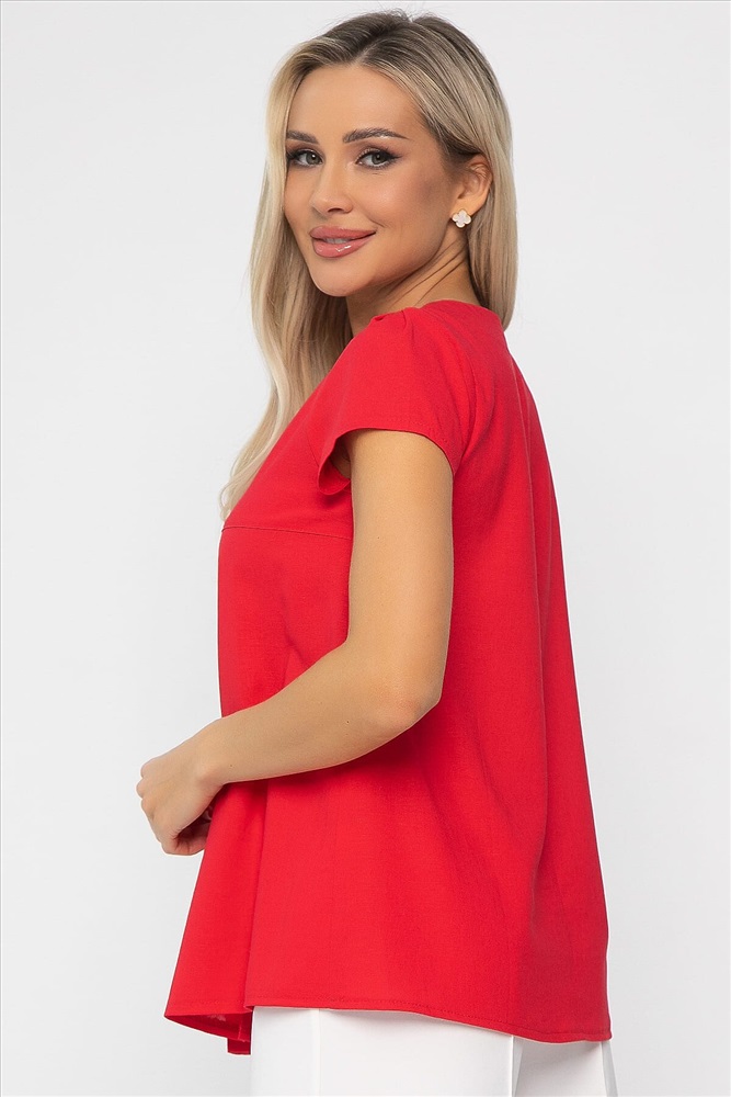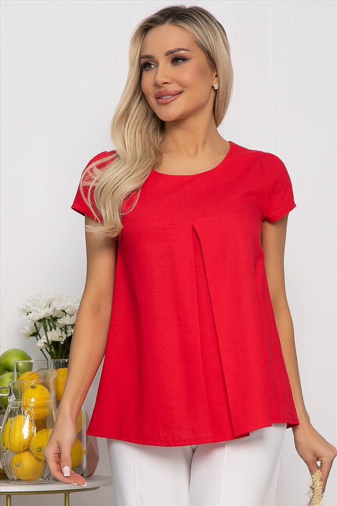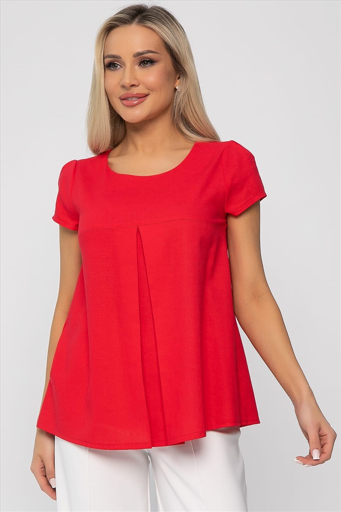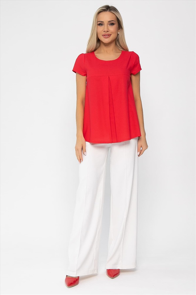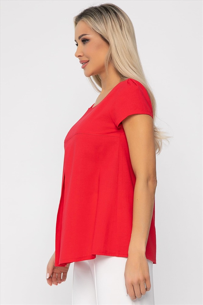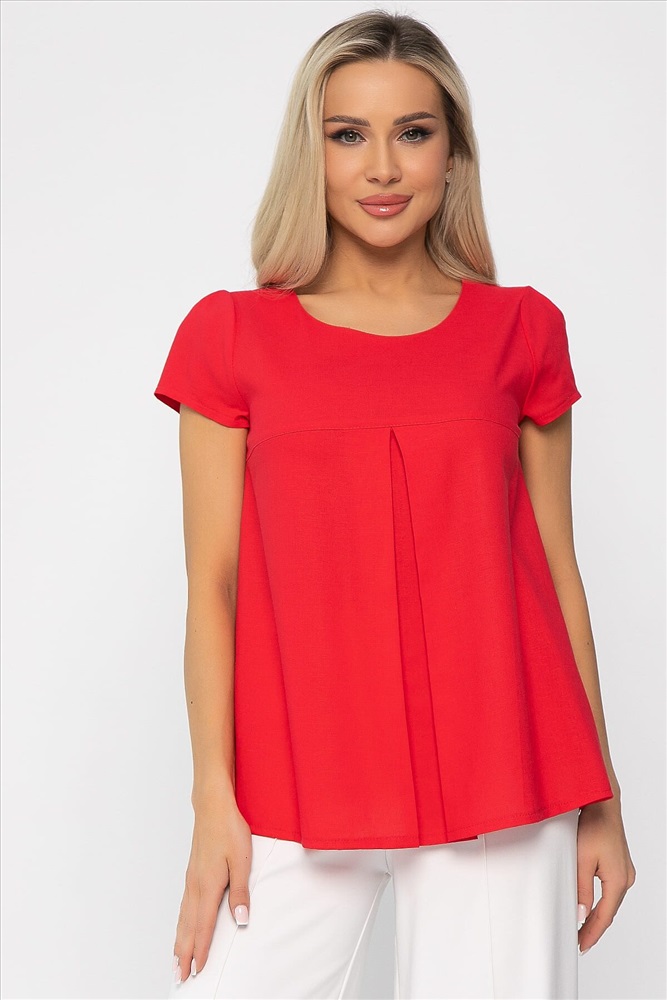 Туника выполнена в классическом А-силуэте, который отлично подчеркивает фигуру и обеспечивает комфорт. Короткие втачные рукава добавляют изделию аккуратности и изящества. Спереди отрезная кокетка, под которой расположена широкая встречная складка — такой диз
