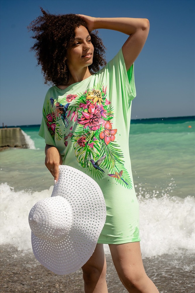 Красивая, универсальная, лёгкая туника свободного фасона. Подходит как для дома, так и для пляжного отдыха. Принт в виде тропической композиции с птичками колибри. Рисунок расположен по диагонали. Длина изделия до середины бедра, свободный, спущенный рукав. Продуманный крой обеспечивает свободу движений и комфорт.