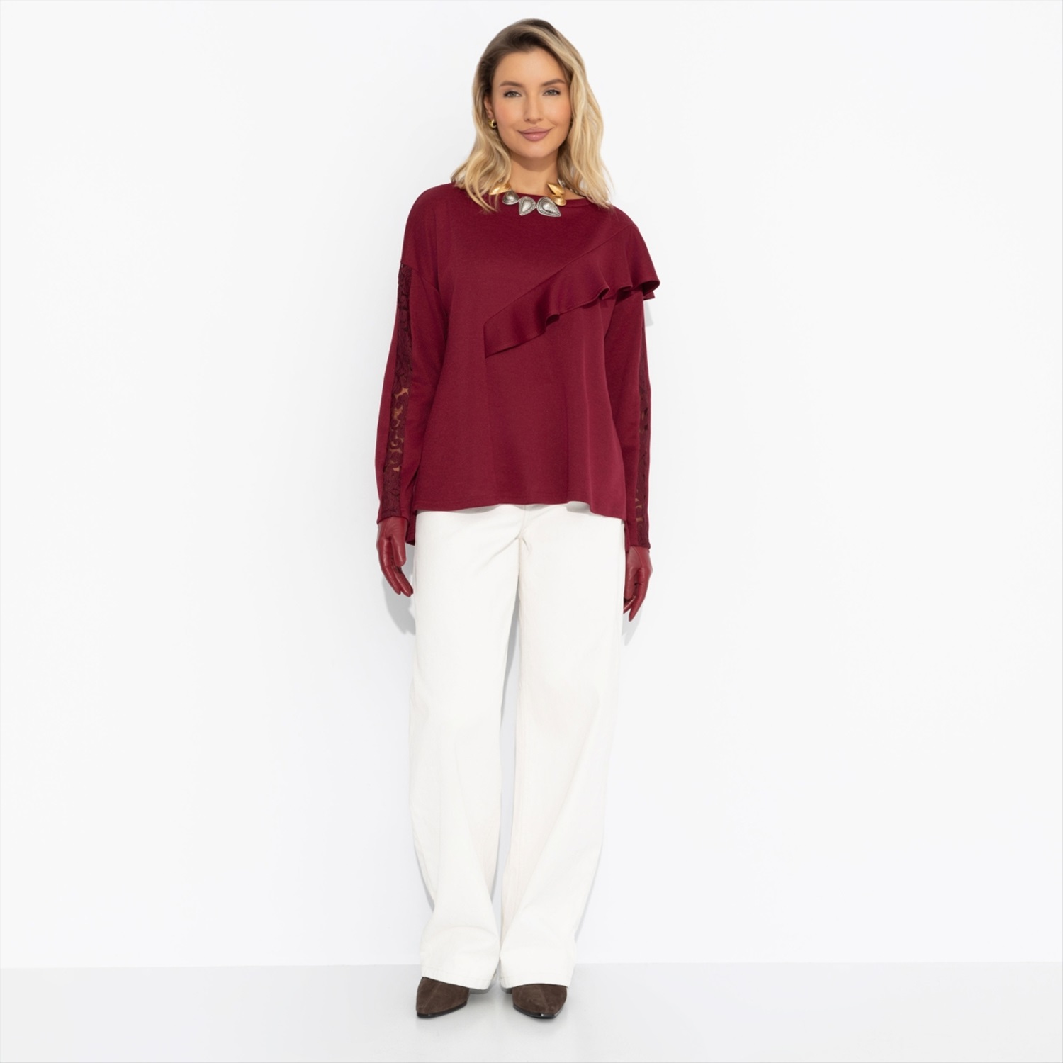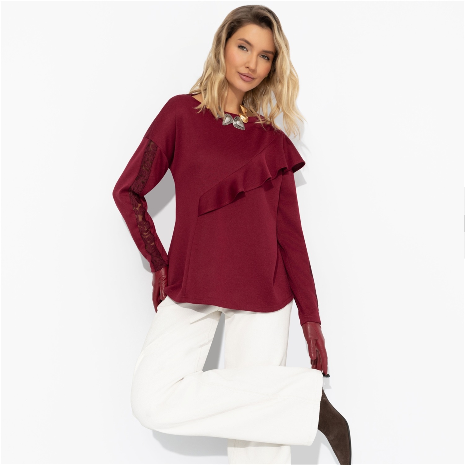 Ваш талисман на прохладное время года от ЧАРУТТИ. Глубокий винный цвет, акцентный крой изделия и шлейф женственности, обычно не свойственный столь комфортным изделиям. Туника ЧАРУТТИ создана для теплых объятий. Туника прямого силуэта. Объемный декор в виде рюш по центральной части изделия. Тонкая вставка кружева в тон изделия по рукавам.
