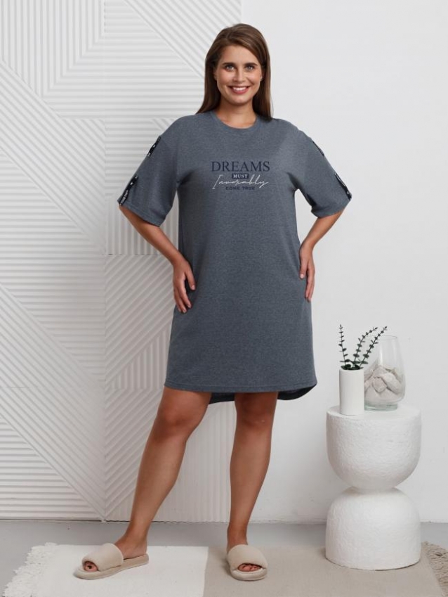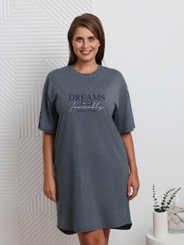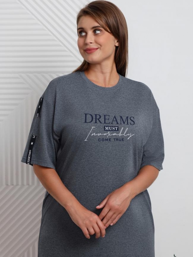 Туника женская из гладкокрашеного «меланжированного» трикотажного полотна «кулирка» прямого силуэта, горловиной овальной формы, обработанной втачной планкой, короткими втачными рукавами и фигурным низом. На рукавах модным элементом является отделка декоративной лентой, продетой в две обметанные петли. На полочке выполнен принт в технике «шелкографии».