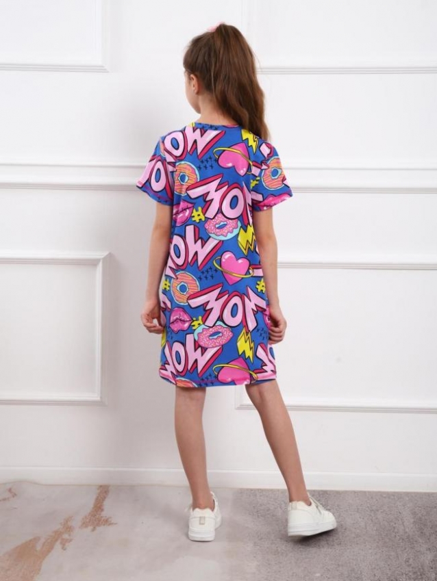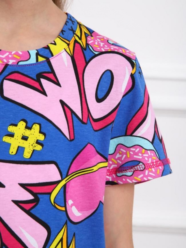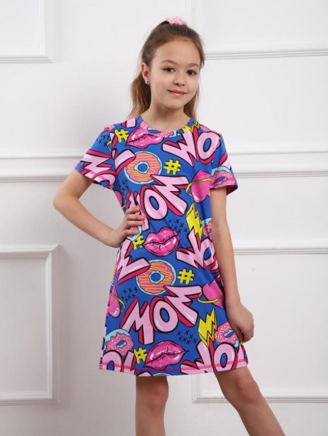 Базовая туника на девочку выполненная из хлопкового полотна пестрой расцветки. Изделие с коротким втачным рукавом и круглой горловиной.