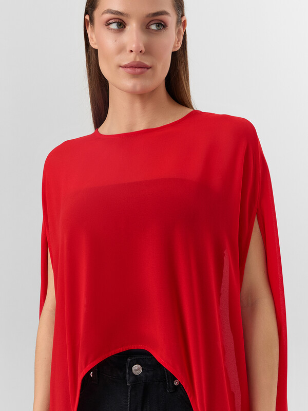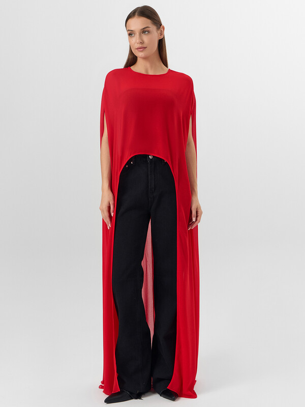 Круглая горловина с аккуратной отделкой и разрез на спинке с декоративной пуговицей отражают тщательную проработку каждой детали. Укороченный перед и удлиненная спинка образуют изящный фигурный край, а боковые разрезы вместо классических рукавов добавляют модели легкости.