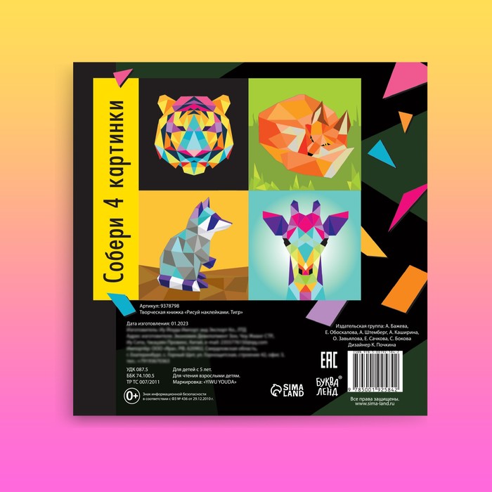 Габариты: 19 x 19 x 0,3 Страна: Китай В боксе: 330 шт Состав: Бумага, бумага самоклеящаяся Материалы: бумага, бумага самоклеящаяся Фасовка: по 1 шт Индивидуальная упаковка: Пакет Габариты товара: 19 см × 0,2 см × 19 см Сертификат: ЕАС Набор: Нет Для кого: Унисекс Формат: Квадрат Возраст: От 5 лет Количество страниц: 12 Год издания: 2023 Тематика: Животный мир Символ года: Нет Тематика праздника: Универсальная тематика Возраст: Детский Материал для аппликации: Наклейки Вид наклейки: Бумажная Тип обложки: Мягкий переплёт Автор: Коллектив авторов Творческая книга «Рисуй наклейками. Тигр» — это увлекательная книжка для детей, которая позволяет создавать уникальные аппликации с изображениями хищных кошек. На 12 страницах собраны яркие картинки, которые можно оживить с помощью множества наклеек. Такой процесс не только развлекает, но и помогает развивать моторику и воображение ребенка. Особенности