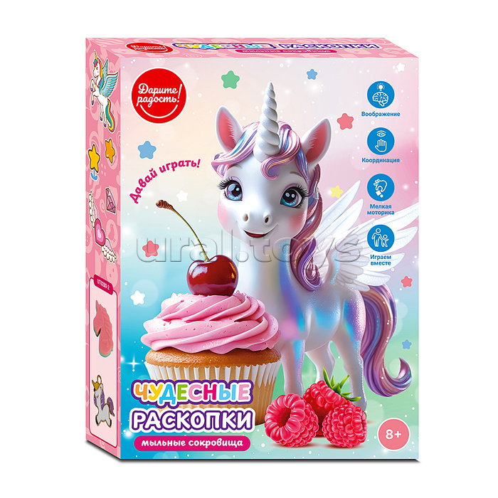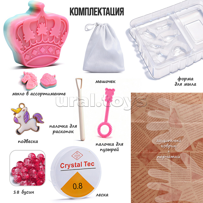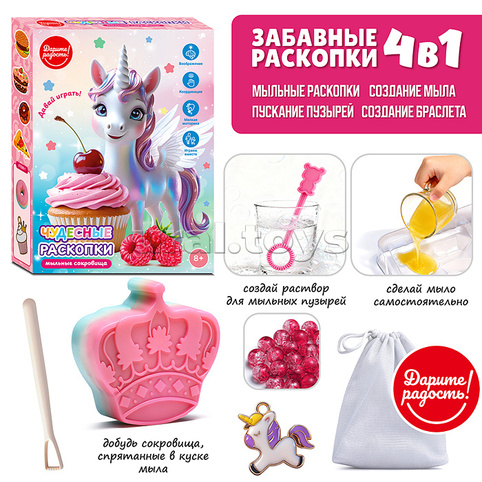 Код: 492544 Штрихкод: 4630432220149 Страна производитель: Китай Размеры упаковки: 16 x 4.5 x 21.5 см Количество в коробке: 36 • В наборе: - фигурка из мыла (10х2х6 см.) - защитный коврик. - перчатки. - подвеска. - леска для браслета. - бусины (18 шт.) - мешок. - палочка для раскопок. - палочка для пузырей. • Соответствует требованиям безопасности продукции. • Для детей от 8 лет. Комментарии к товару