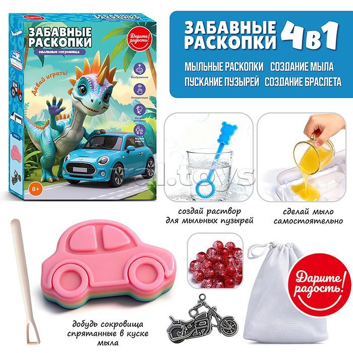 Код: 492546 Штрихкод: 4630432220163 Страна производитель: Китай Размеры упаковки: 16 x 4.5 x 21.5 см Количество в коробке: 36 • В наборе: - фигурка из мыла (10х2х6 см.) - защитный коврик. - перчатки. - подвеска. - леска для браслета. - бусины (18 шт.) - мешок. - палочка для раскопок. - палочка для пузырей. • Творчество начинается с раскопок, в ходе которых из мыльной фигурки извлекается подвеска. • Соответствует требованиям безопасности продукции. • Для детей от 8 лет. Комментарии к товару