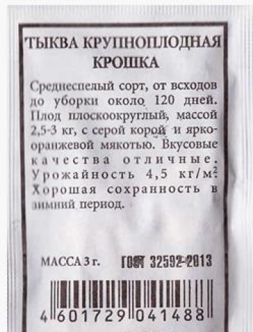 Одна из самых вкусных столовых тыкв. Среднепоздняя, вызревает примерно через 120 дней от всходов. Растения длинноплетистые, с хорошей устойчивостью к антракнозу. Плоды плоскоокруглые, гладкие, некрупные – массой 2,5-3 кг. Мякоть ярко-оранжевая, плотная, сладкая; может использоваться в сыром виде в салатах и для всех видов традиционной кулинарной переработки. Сорт лежкий, отличные потребительские качества плодов сохраняются до марта.