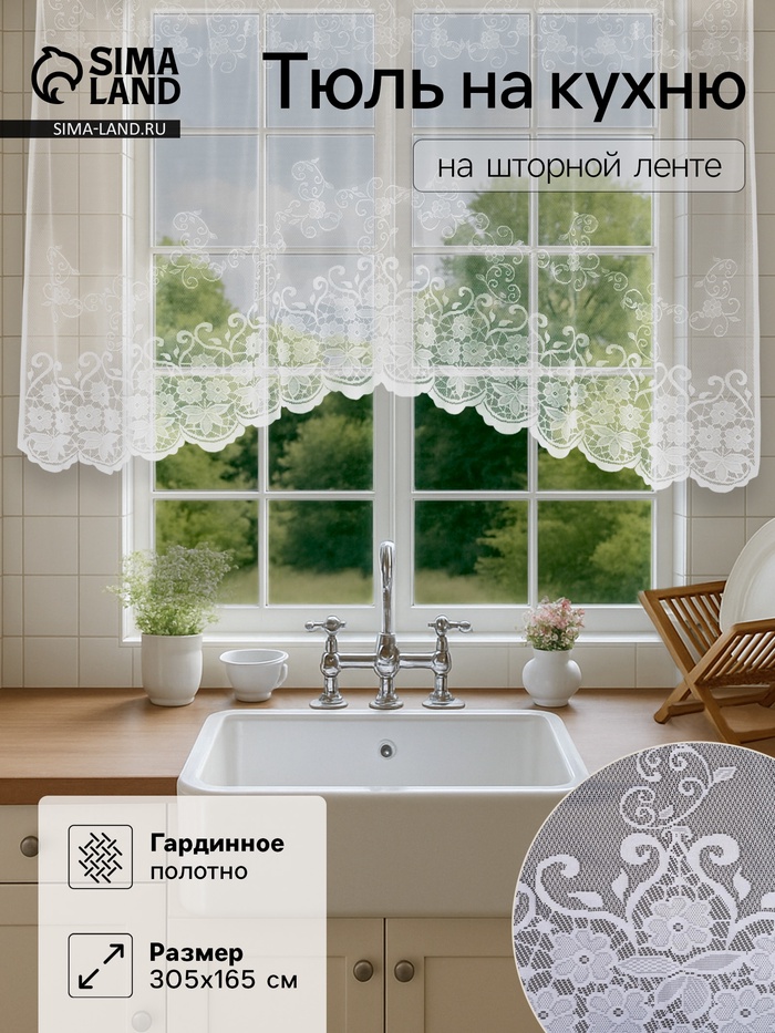 Тюль на кухню со шторной лентой, 305×165 см, цвет белый, 100% полиэстер украсит помещение и обновит внешний вид кухни. Изящное цветочное оформление и невесомая фактура подчеркнут общий интерьер.