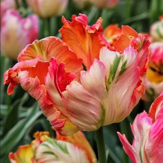 Класс Попугайные. Высота растения 40-50 см. Цветок абрикосовой окраски, с сизо-зелеными штрихами по задней спинке лепестков, диаметром 12...15 см. Края лепестков зазубренные, волнистые, лопастные, напоминающие оперение попугая. Срок цветения: вторая декада мая - начало июня.